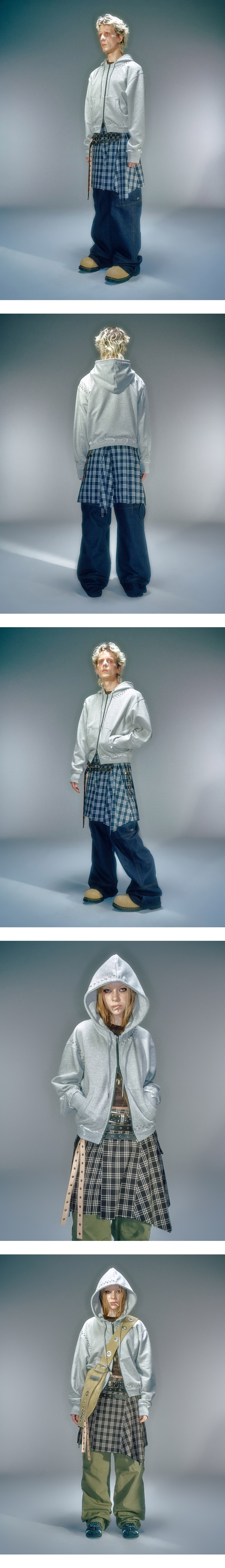 부드러운 터치감과 가벼운 두께감의 와이드핏 후드 집업 후드, 몸판 , 소매 부분적으로 핫픽스 포인트 인사이드 아웃 절개로 빈티지 무드한 무드 연출