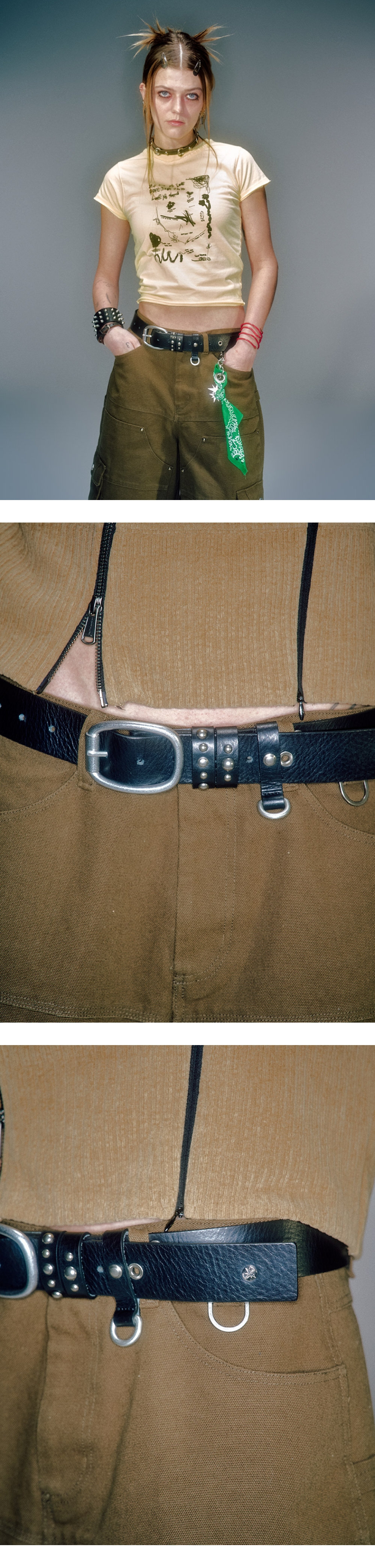 소가죽 소재 사용 유니섹스로 사용할 수 있는 길이감 베이컨트 심볼 리벳 포인트 빈티지 무드의 도금 장식 사용
