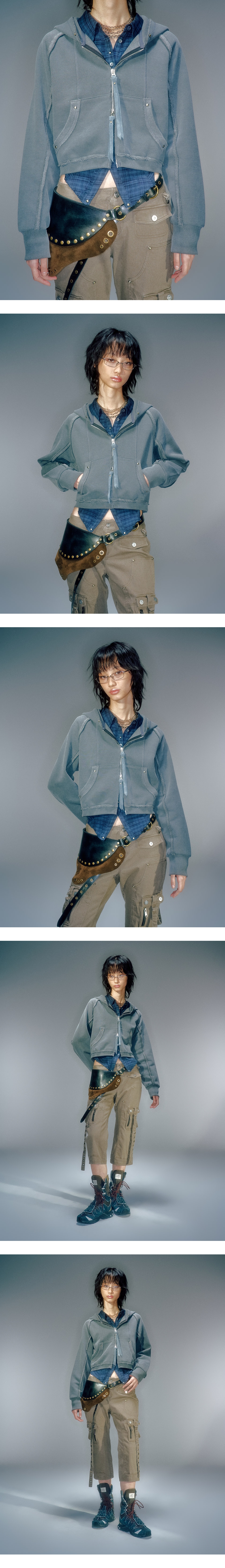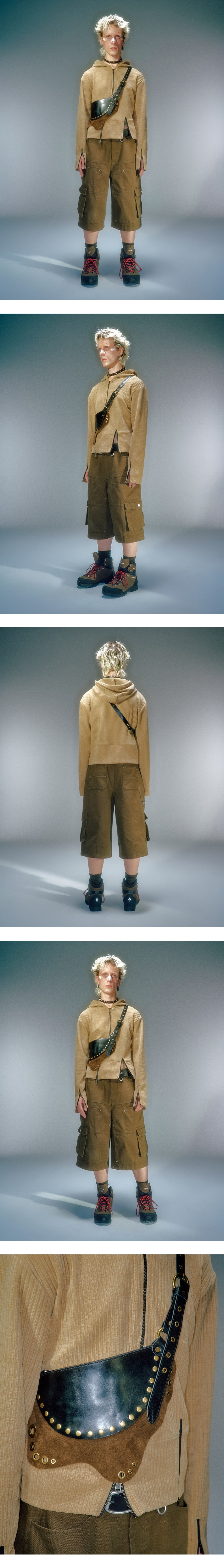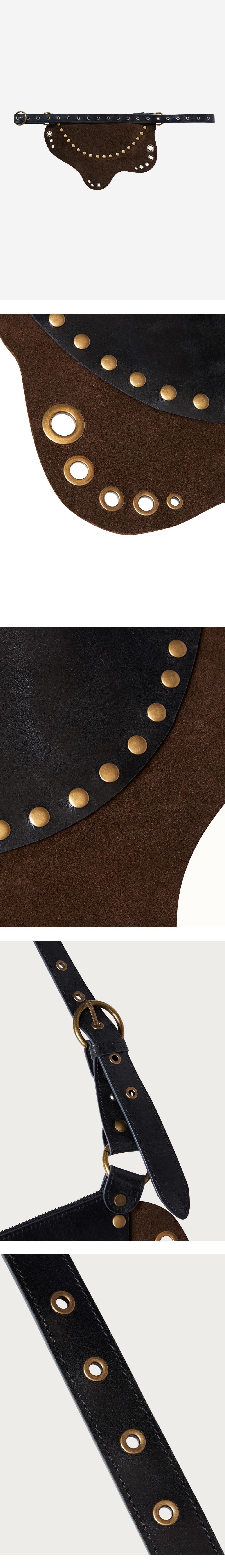 소가죽, 스웨이드 배색의 반달 쉐잎 미니 벨트 백 플랫한 디자인으로 양면 모두 연출 스웨이드 부분의 아일렛 디테일 착용 방법에 따라 다양한 스타일링 가능 화섬 소재로 안감 사용하여 이염 없이 수납 가능
