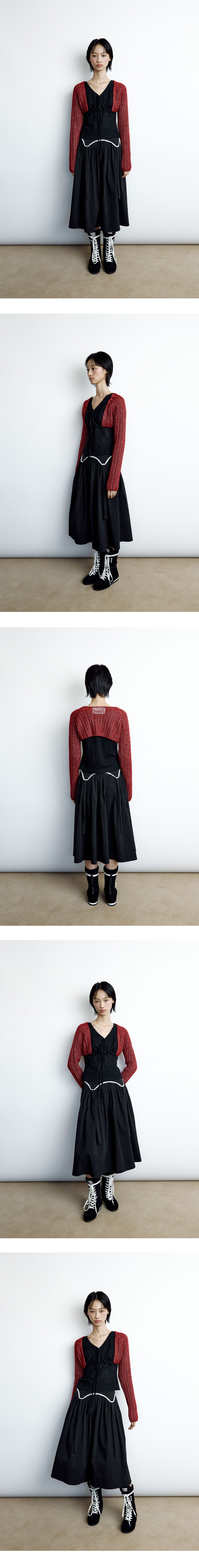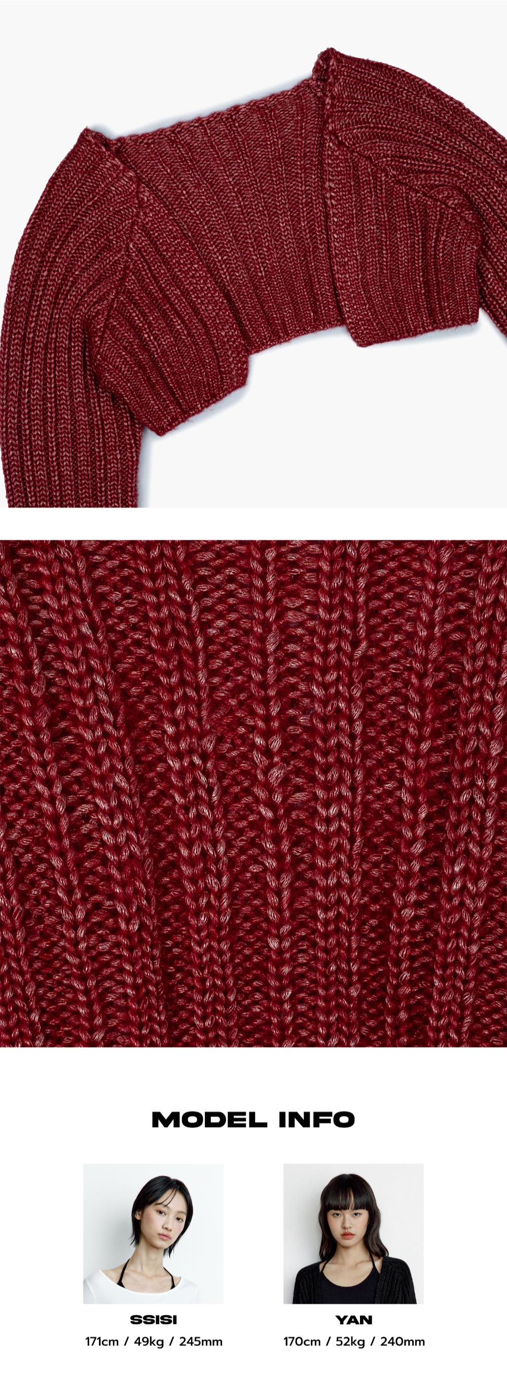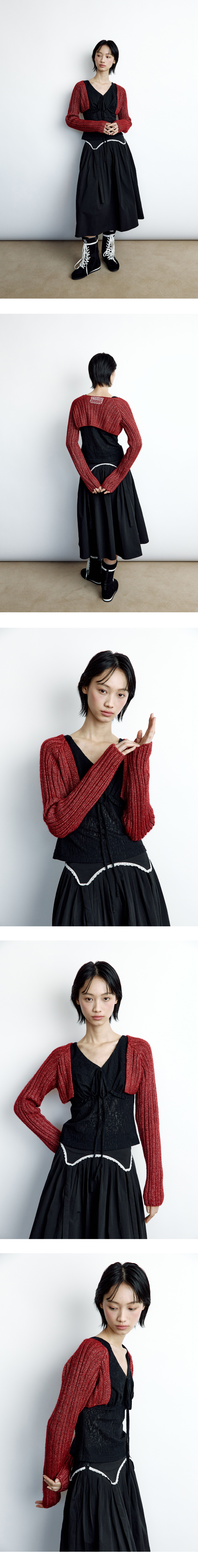 울 소재의 부드러운 볼레로로, 도톰한 두께감이 포근한 착용감을 제공합니다. 신축성이 뛰어나 편안하며 베이직한 디자인으로 다양한 스타일링이 가능합니다. 길게 디자인된 소매가 귀여운 무드를 더해주는 사랑스러운 제품입니다. - Wool 63% Polyester 37% - Model Info : YAN (170cm / 52kg) / SSISI (171cm / 49kg) - Fitting size : S