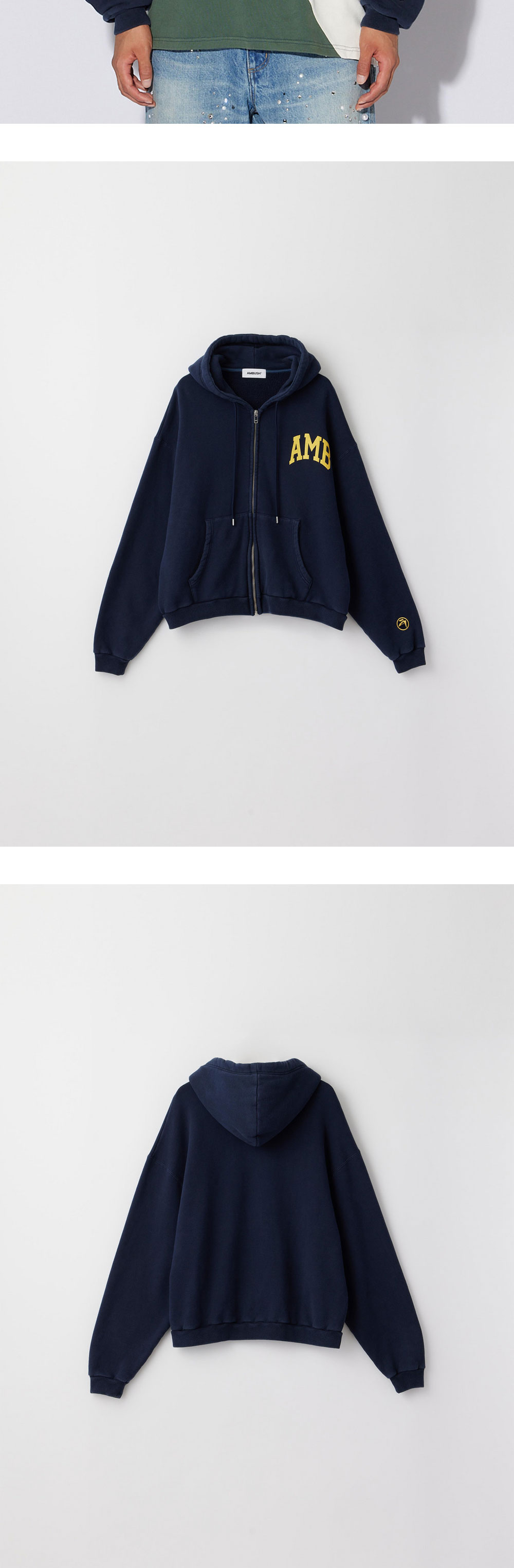 네이비와 옐로우의 조화가 매력적인 앰부쉬의 맨즈 AMB 그래픽 집업 후디 네이비입니다. - 오버핏 - 옐로우 로고 디테일 - 면 100%