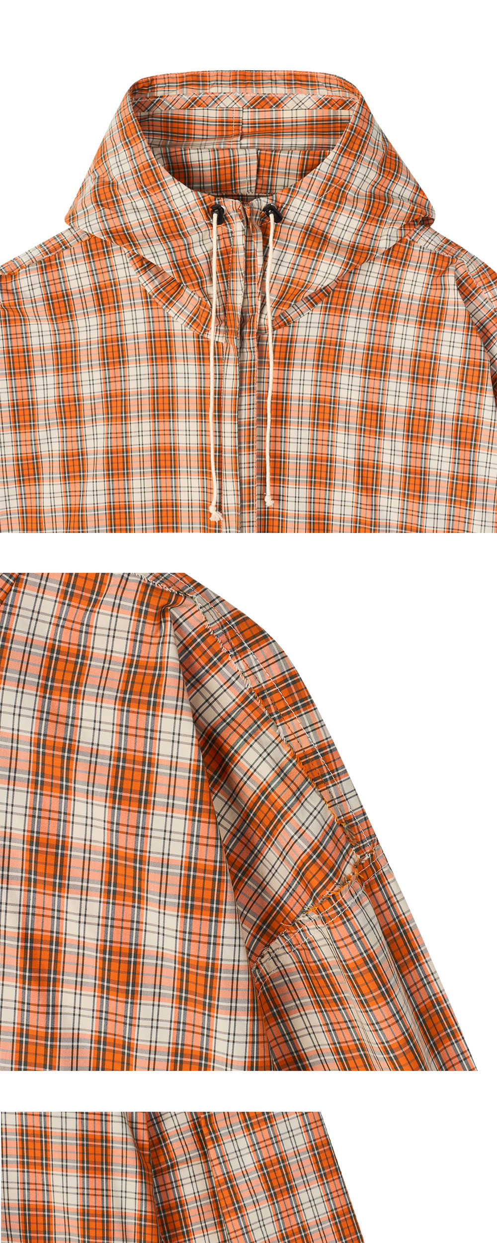 오렌지 컬러의 체크 디자인이 매력적인 카미엘 포트젠스의 크롭 아웃도어 자켓 테크니컬 코튼 오렌지 브라운 체크입니다. - 가벼운 무게 - 방풍 나일론 소재 - 크롭 언라인 아웃도어 재킷 - 끈이 달린 후드 - 하이넥 지퍼 클로저 - 두 개의 큰 플랩 포켓 - 고르지 않은 밑단 마감 디테일