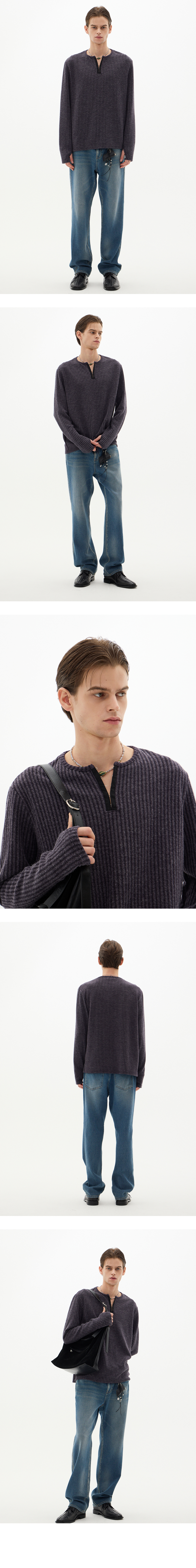 유연한 골지 짜임의 리브드 후크 헨리넥 티셔츠 가벼운 원단감으로 몸에 감기는 실루엣과 모던한 분위기 연출 썸홀, 후크, 배색으로 빈티지한 무드와 유니크한 디테일 컬러 : 바이올렛 원단 : 폴리에스터 84%, 레이온 13%, 스판 3% 레귤러핏 탄탄한 넥 라인 후크 헨리넥 리브드 조직의 깊이감 있는 텍스처 봄, 여름, 가을, 겨울에 적합한 두께 MODEL SIZE1 : 187cm / 65kg L SiZE - 측정 기준에 따라 1~2cm의 오차 범위가 발생할 수 있습니다. 주문 시 르아제 "라임바질만다린" 향을 박스 안에 분무하여 출고 합니다. 향을 싫어 하실 경우 배송 메세지 함에 향X 라고 기재 부탁드립니다.