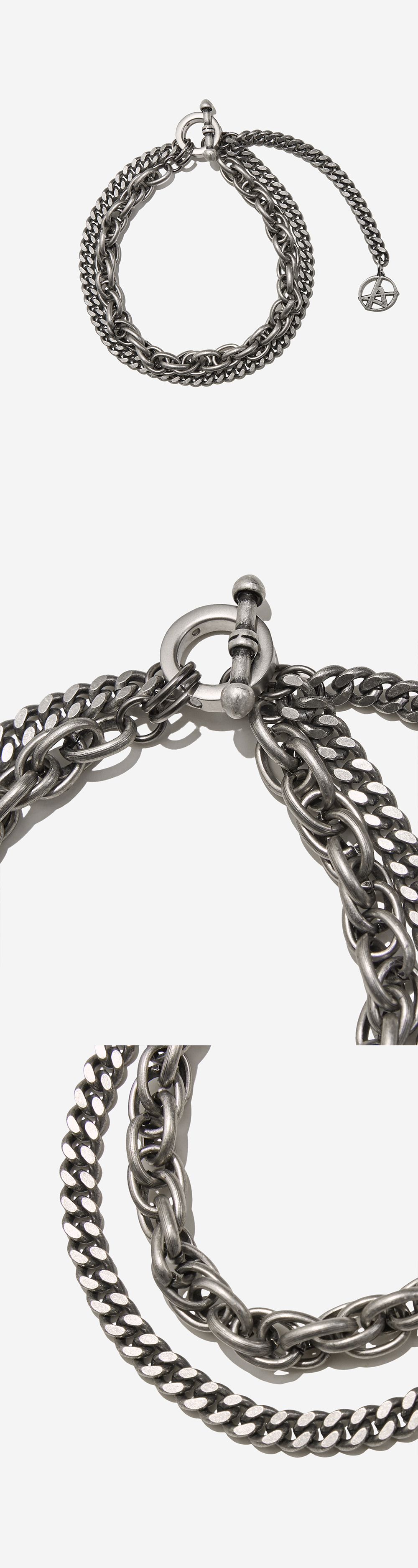 볼드한 분위기의 커브 체인과 로프 체인을 믹스한 디자인의 팔찌입니다. 단품 및 레이어드 모두 활용도가 높은 제품입니다. - DETAIL - 로고 메탈 참