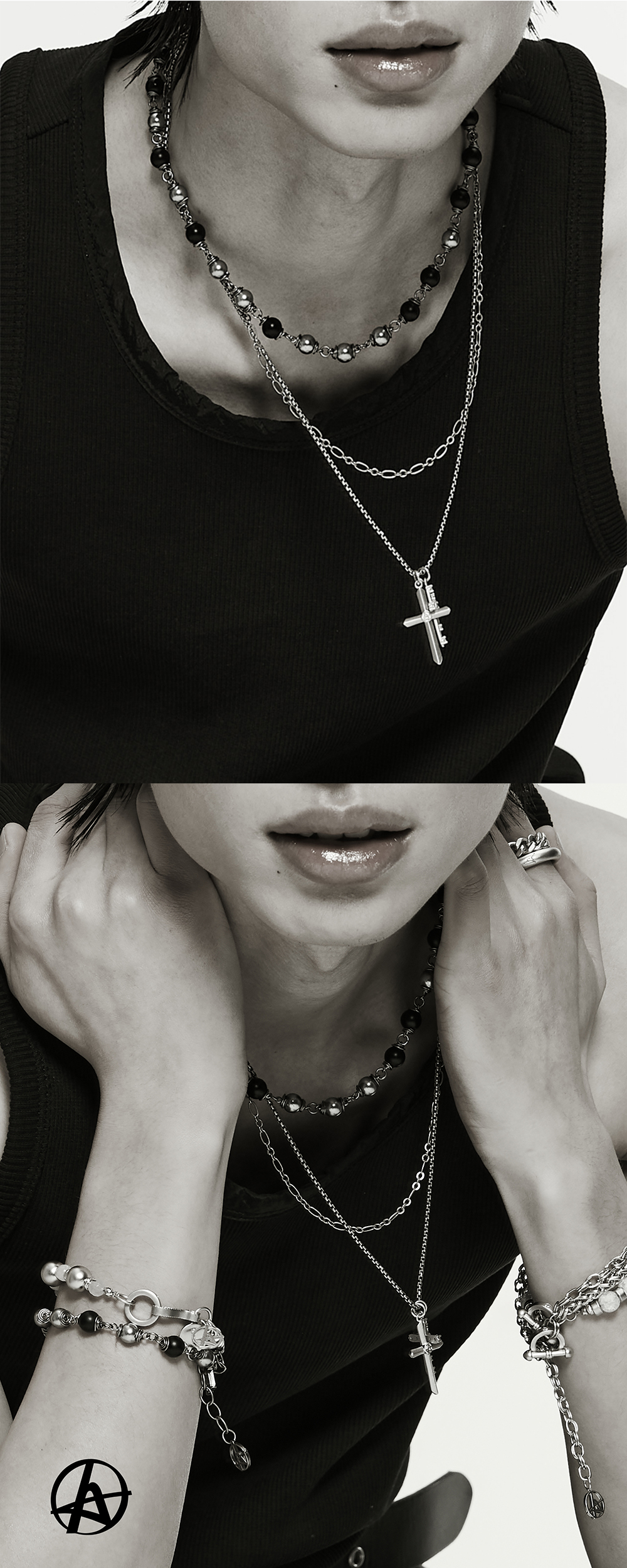 메탈릭 진주와 매트 블랙 천연석의 조화가 매력적인 목걸이입니다. *천연 원석 특성상 개체 차이가 있을 수 있는 점 참고 부탁드립니다.* 수작업으로 철사를 연결시키는 과정에서 미세한 기스가 있을 수 있습니다. - DEATIL - 로고 메탈 참