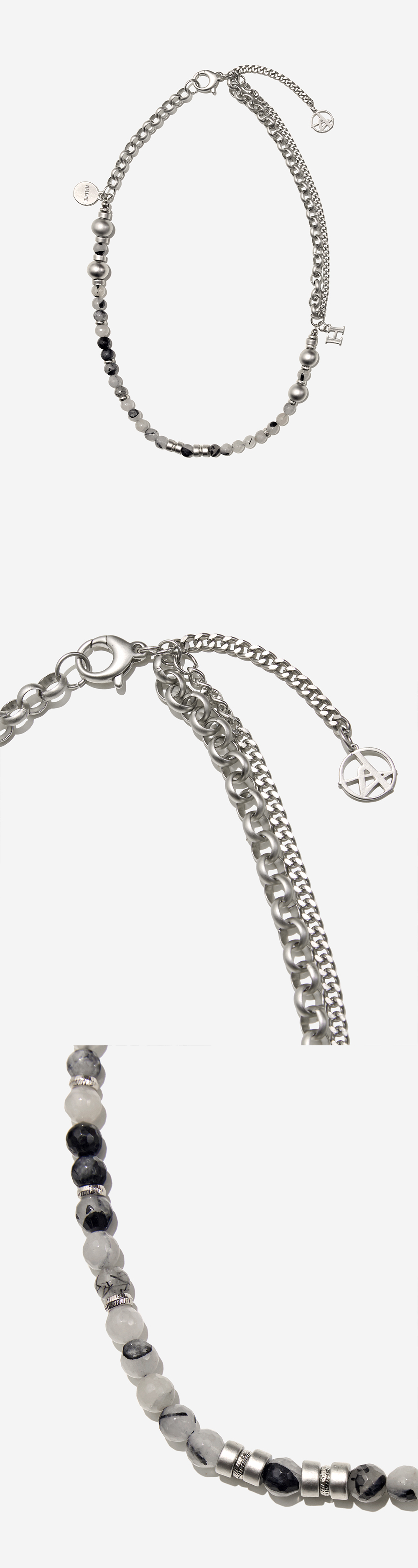 천연 원석과 메탈 체인들을 레이어드하여 유니크한 디자인을 연출한 목걸이입니다. 원석과 메탈이 적절히 믹스되어 있어 착용 위치에 따라 다양한 연출이 가능한 제품입니다. - DEATIL - 메탈 로고 참 비대칭 레어이드 디자인