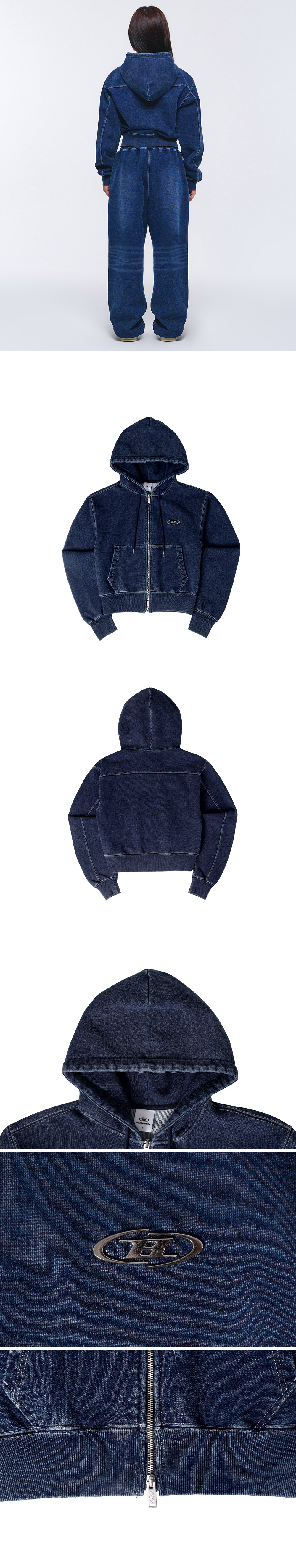 [DETAILS] * 우먼스 데님라이크 후디 집업 - 인디고 코튼 100% - 빈티지 무드 가먼트 워싱 - 크롬 B 로고 - 캥거루 포켓 - 크롭핏 [DETAILS] * 피그먼트 원단 특성상, 이염의 우려가 있으니 단독 세탁 권장드립니다. Material : Cotton 100% Fitting : NH 1 Size, 162cm, 46kg