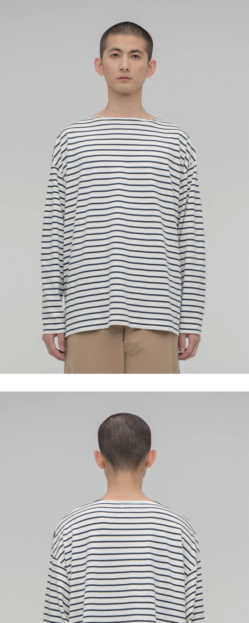 수빈 코튼 중에서도 특히 고품질의 희귀한 "수빈 골드"로 만든 시오타의 보더 롱 슬리브 셔츠 네이비입니다. - 실크와 같은 광택 - 캐시미어와 같은 촉감 - 약간 얇은 소재로 봄 여름 시즌에 추천 - 깔끔한 디자인 - 톡톡하고 매끄러운 느낌