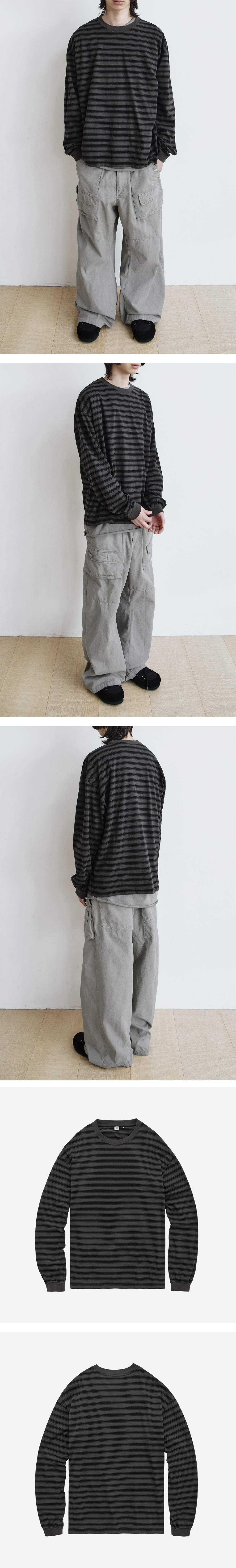 striped long sleeve - ecru, blue, charcoal - 오리지널 배열 디자인 후 별도 편직한 코튼 소재 - 완성 후 추가 워싱 및 다잉 적용하여 자연스럽고 부드러운 색감 - round neck sleeve 베이스로 실루엣, 소재를 한층 더 발전시킨 패턴 - 넉넉한 실루엣감 - 디자이너가 몇년 입은 티셔츠의 후들한 컨디션 재현 - 적절한 RIB 두께 *모델: 178cm / 마른 체형, 3사이즈 착용 *직전 차수 대비, 금번 차수의 경우 유사한 컬러감, 유사한 피팅감으로 제작되었습니다.
