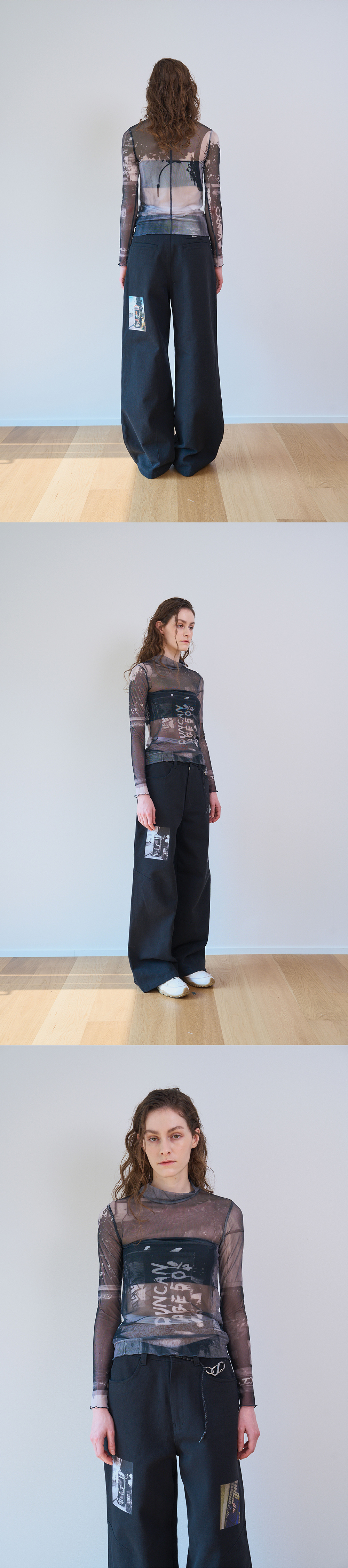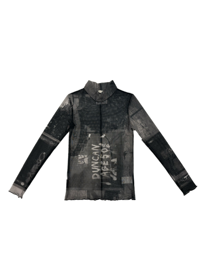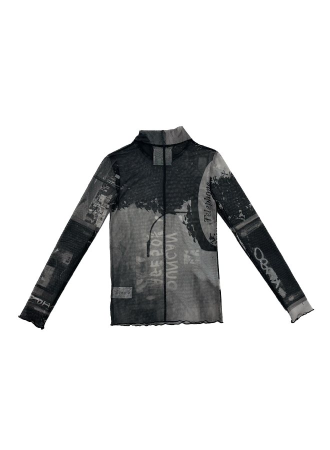 DETAIL Photo printed throughout High neck Silm fit Sheer mesh fabric Finished with interlock stitching Interlock stitching at center back 포토 프린팅 낮은 하이넥 슬림핏 메쉬 원단 인타로크 마감 *스티치 컬러가 원단에 더 잘 어울리는 연핑크 컬러로 변경되었습니다. COMPOSITION Polyester 98%, Span 2% SIZE MEASUREMENT - Size OS : Length 55cm_Chest 36cm_ Shoulder 30cm_Sleeve 57cm Made in South Korea Washing instructions Dry clean recommended Hand wash cold Wash separately Do not bleach