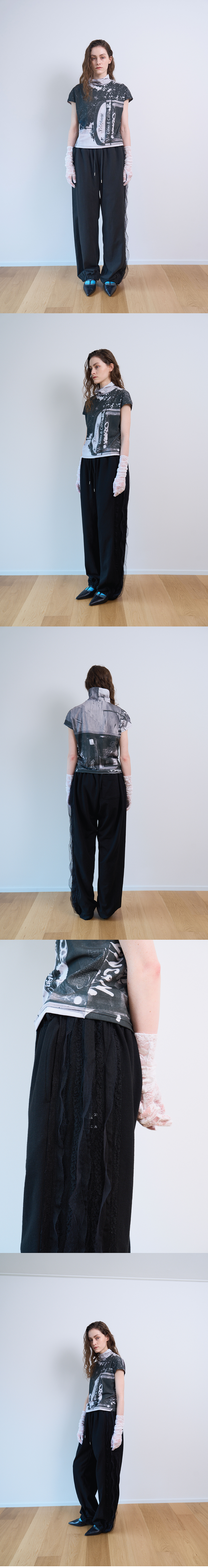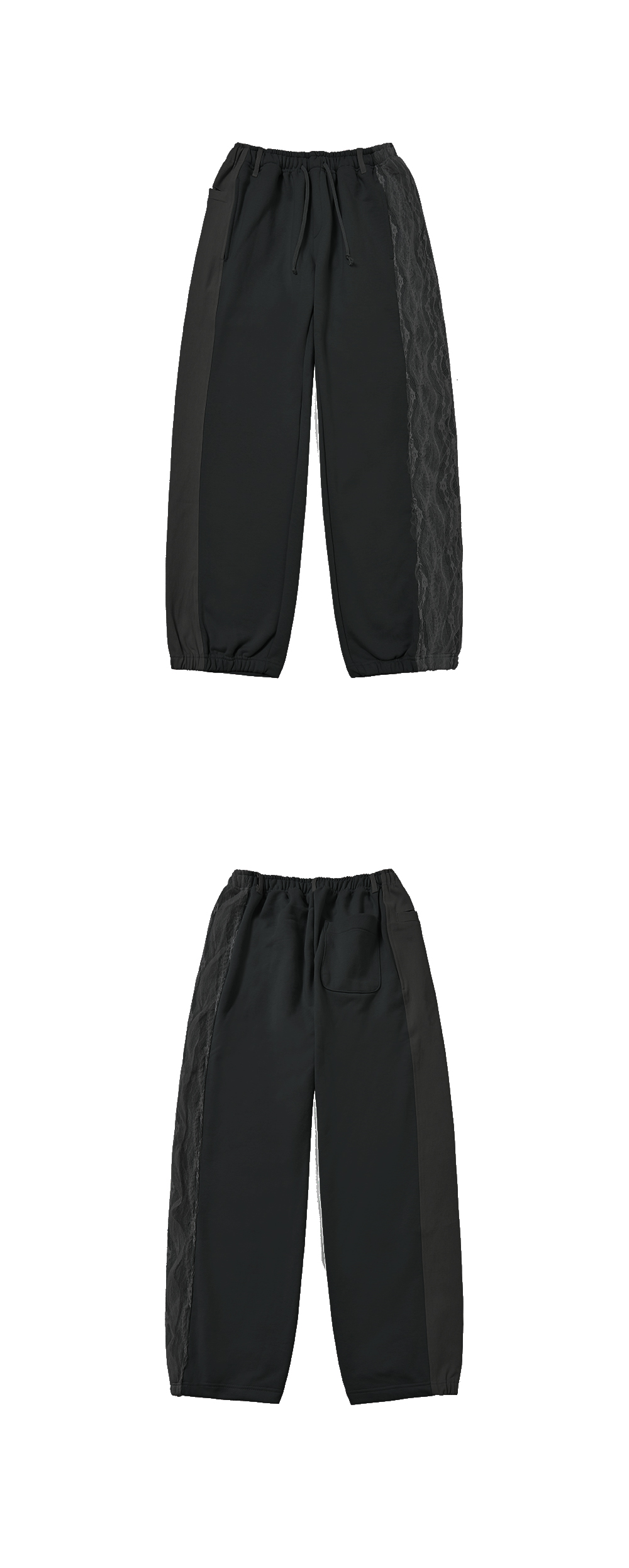 DETAIL Wide fit Paneled construction Lace panel at left side 4 pocket styling Drawstring at elasticated waist band 와이드핏 사이드 코튼 패널 왼쪽에 레이스 패널 웨이스트 스트링 벨트고리 디테일 사이드포켓, 백포켓 등 4개의 포켓 COMPOSITION Cotton 65%, Polyester 45% Panel: Cotton 100% SIZE MEASUREMENT - Size S: Length 101cm_Waist 34cm (Elasticated)_Rise 32cm_Thigh 33cm_Hem 22cm - Size M: Length 106cm_Waist 38cm (Elasticated)_Rise 34cm_Thigh 34cm_Hem 23cm Made in S o u t h Korea Washing instructions Dry clean recommended Hand wash cold Wash separately Do not bleach