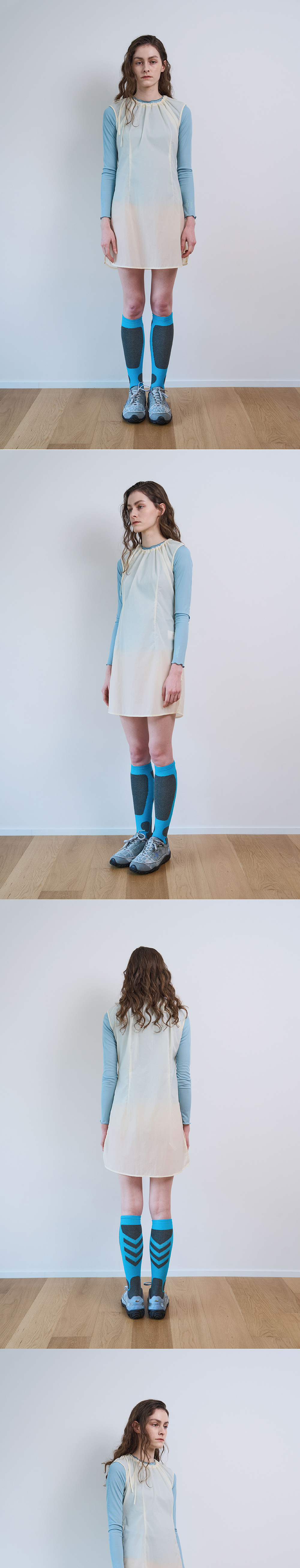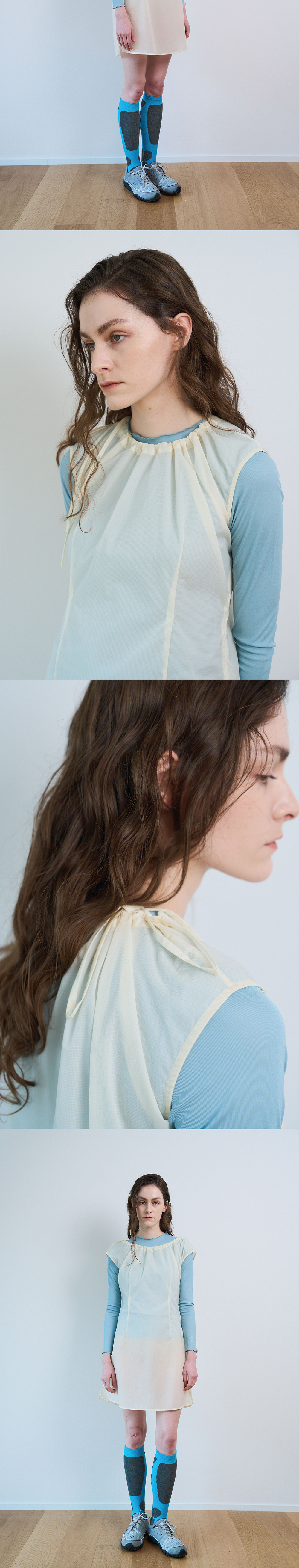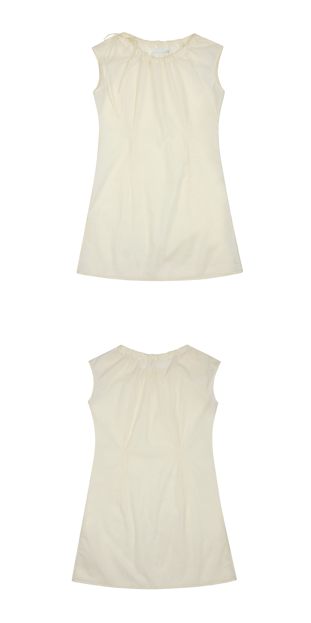 DETAIL Light weight sleeveless nylon top. Adjustable neckline with strap. Zip closure at side seam. Darts at waist. Water-repellent. 경랑 나일론소재의 슬리브리스 탑 스트랩으로 넥라인 조절 허리에 다트 디테일 생활 방수 원단 COMPOSITION Nylon 100% SIZE MEASUREMENT - Size OS: Length 83cm_Chest 49cm_ Shoulder 53 (adjustable) cm Made in South Korea Washing instructions Dry clean recommended Hand wash cold Wash separately Do not bleach