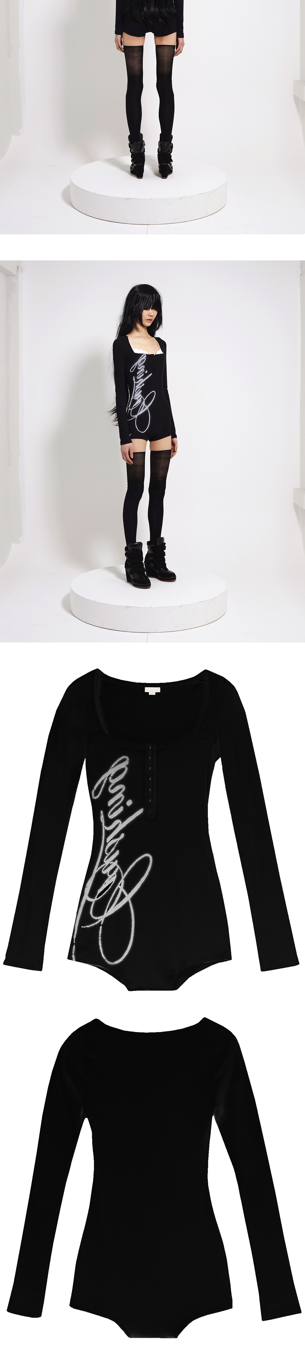 스퀘어넥 바디수트 앞 중심 후크 여밈 레터링 디지털 프린팅 가볍고 신축성이 있는 골지 원단 Size(Length/Shoulder/Chest/Sleeve) 1 : 71.5m/30cm/32cm/67.5cm 2 : 71.5m/30.5cm/35cm/67.5cm Polyester 95% Span 5%