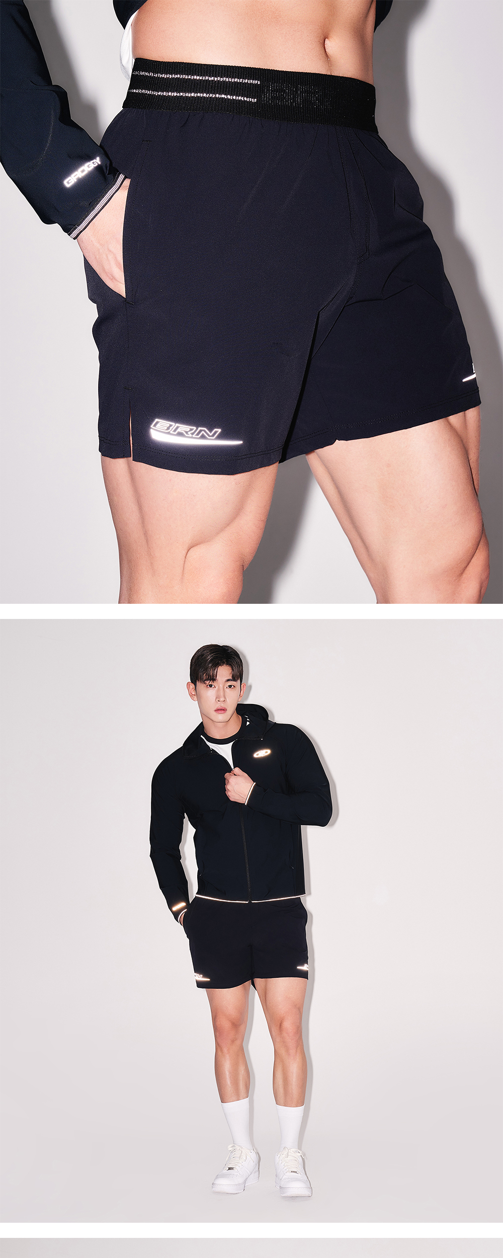 [DETAILS] * 리플렉티브 아웃 밴드 액티브 쇼츠 - 나일론 스트레치 우븐 원단 - 리플렉티브 로고 밴드 - 사이드 오픈 포켓 및 후면 지퍼 포켓 - 로고 그래픽 포인트 Material : Nylon 85%, Polyurethane 15% Fitting : DJ 3 Size, 183cm, 88kg