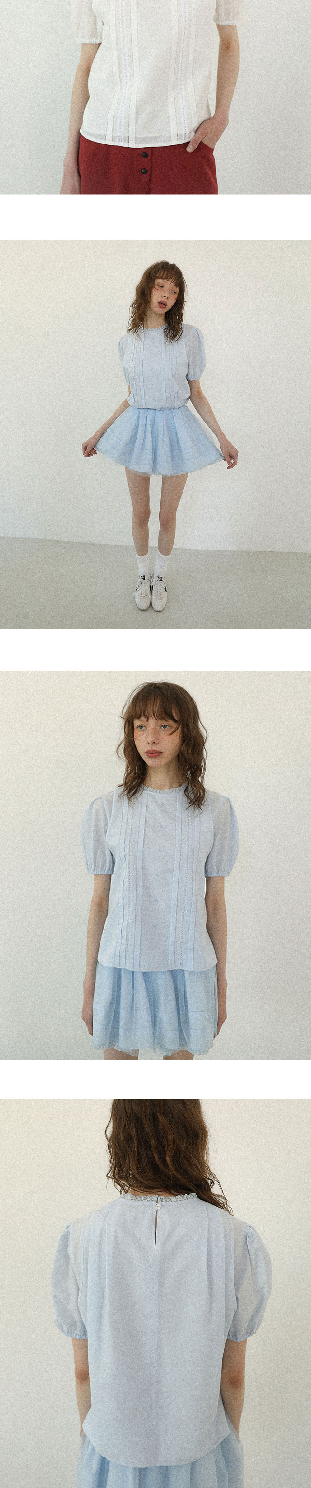 - 이중으로 봉제된 퍼프 슬리브 레이스 블라우스 - 코튼 혼방 소재를 사용하여 부드러운 터치감 - 볼륨감 있는 퍼프 슬리브와 네크라인 레이스 디테일 - 전면부 자수 포인트