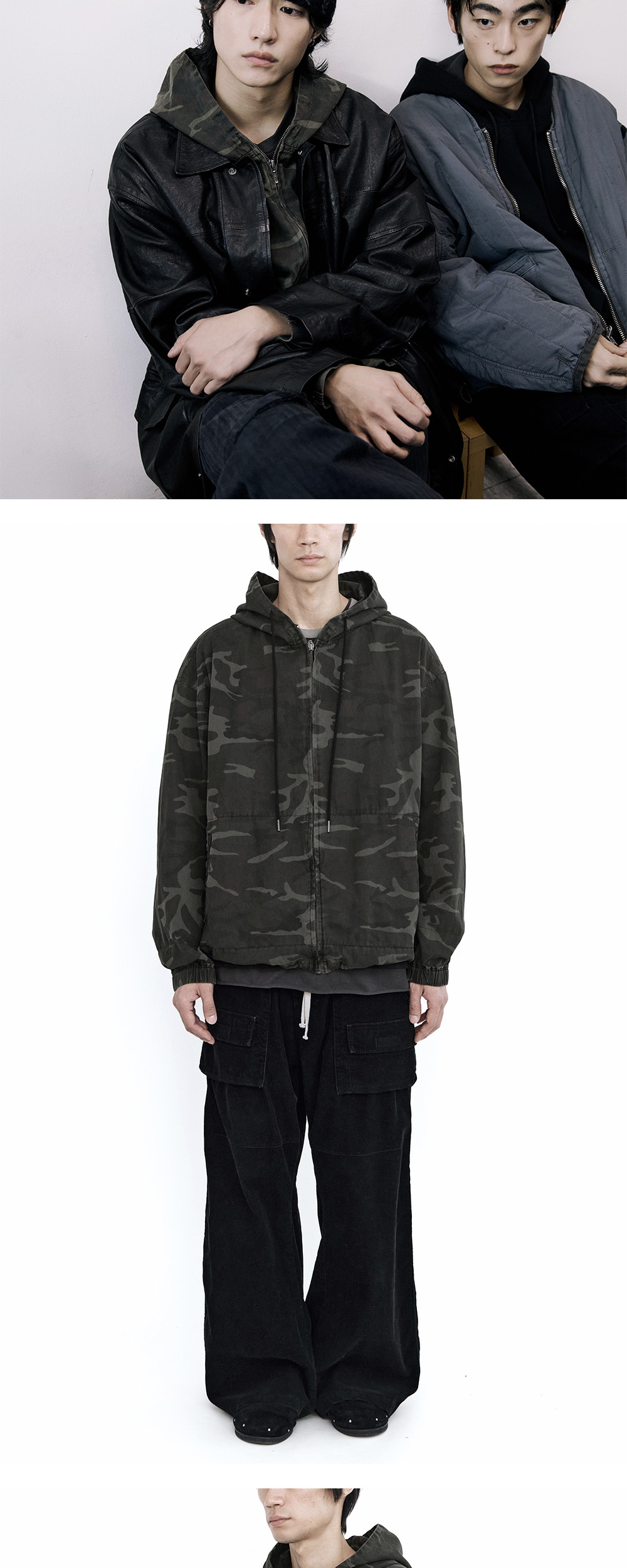 zip hoodie parka - camo - 심플한 구성의 집 파카 - 가먼트 다잉 & 워싱을 통해 은은하게 표현되는 카모플라쥬 - 부드럽게 뭉개지는 실루엣 - 전체적으로 넓은 품, 긴 기장 구성 - 밑단 스트링으로 아웃핏의 전체적인 비례를 다양하게 연출 가능 - 적당히 깊은 후드 사이즈 - 아우터 볼륨에 영향을 주지 않는 부드러운 소재감 *모델: 170 중반 / 마른 체형, 3사이즈 착용 *직전 차수 대비, 금번 차수의 경우 - 미세하게 밝은 톤으로 완성됐습니다. - 어깨 실측을 3~4cm 정도 길게 완성했으며, 타 집 후디 파카 품목군과 유사한 어깨 치수감으로 완성했습니다.