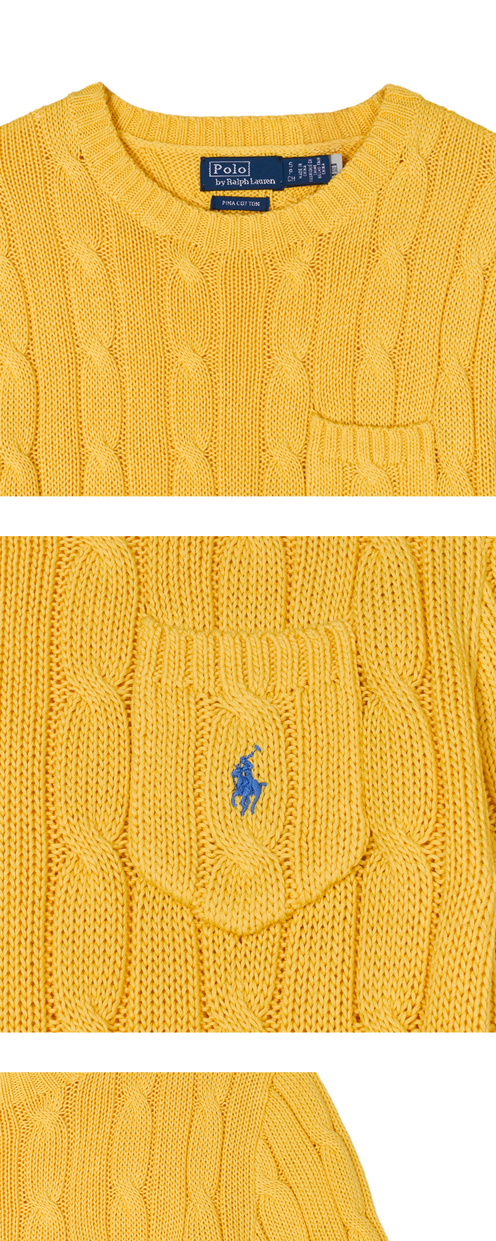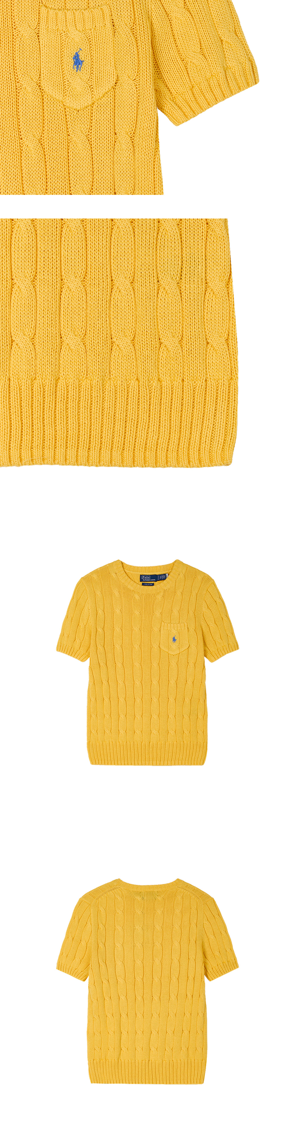< KREAM은 랄프로렌 코리아 공식 파트너사로 모든 상품은 랄프로렌 코리아(유)에서 공급받은 정식 수입 제품입니다 > 컬러가 매력적인 폴로 랄프 로렌의 우먼 케이블 니트 코튼 쇼트 슬리브 스웨터 옐로우입니다. - 슬림핏 - 왼쪽 가슴에 패치 포켓 - 시그니처 포니 자수
