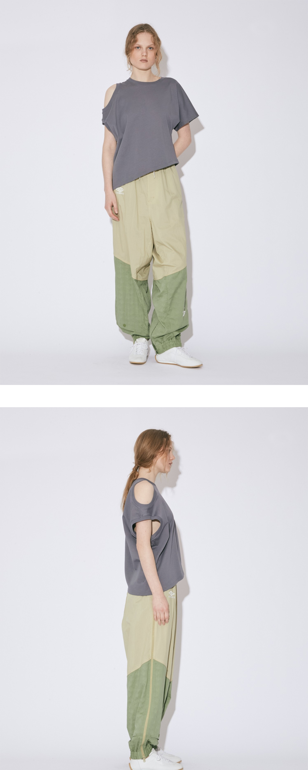 실루엣과 디자인의 변화를 즐길 수 있는 2-way 디자인이 특징인 뷰티풀피플 x 엄브로의 우먼 더블 엔드 나일론 트랙 팬츠 스모크 그린입니다. - 트랙 팬츠와 사루엘 팬츠 두가지 디자인을 모두 즐길 수 있는 아이템 - 양 옆의 지퍼를 열고 조합을 바꿔 닫으면 실루엣과 디자인이 변화 - 허리 둘레 밑위 기장이 안 밑위 기장으로 180°회전해서 변하는 구조패턴 - 콜라보레이션 오리지널 자수 포함