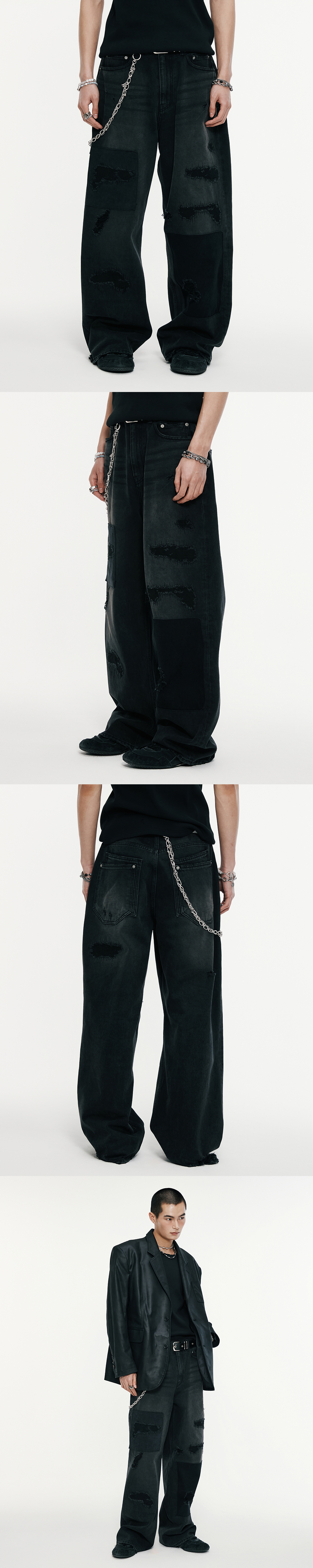 패치워크가 가미된 빈티지한 무드의 워싱진입니다. 내츄럴한 페이딩 및 위스커링 워싱과 패치워크 및 데미지의 조화가 멋스러운 제품입니다. -DETAIL- 위스커링 및 페이딩 워싱 패치워크 및 데미지 디테일 후면 이중 포켓 리벳 디테일