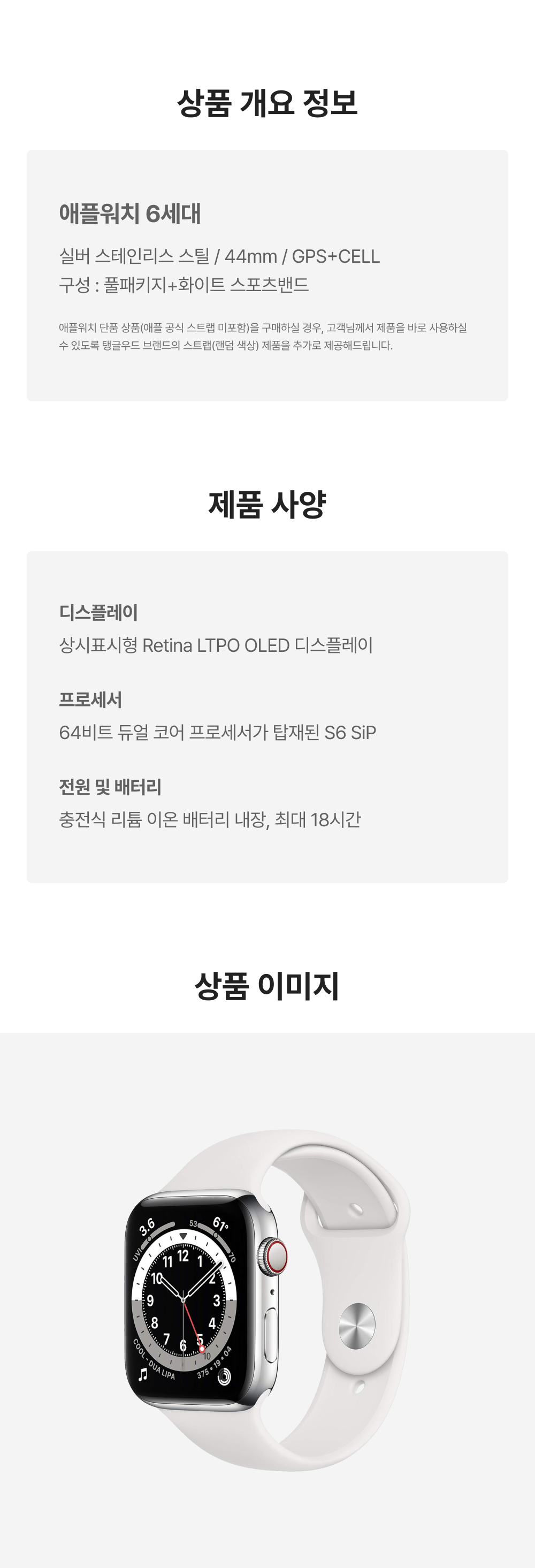 [B등급] 리퍼비시 애플워치 6 44mm 셀룰러 실버 스테인리스 스틸 케이스 스포츠 밴드 화이트