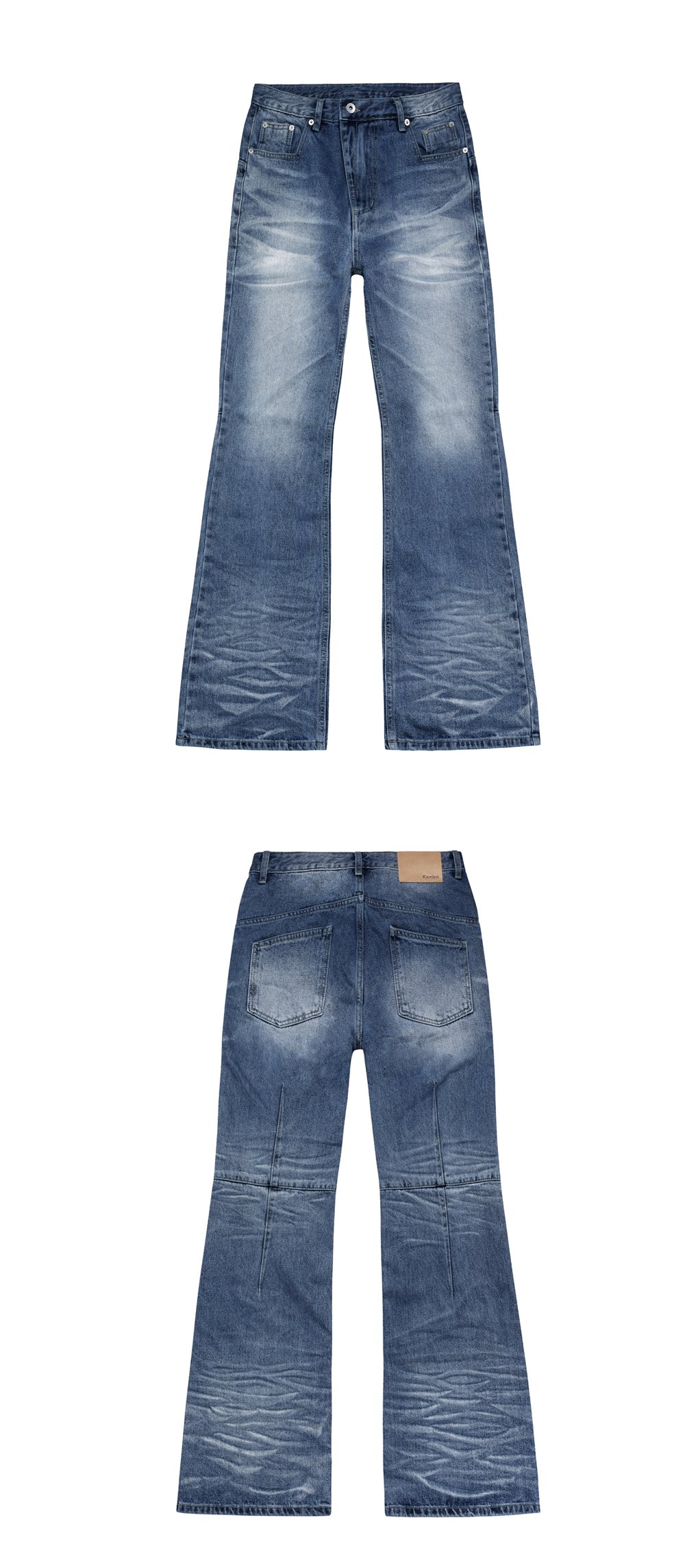 절개 디테일과 플레어 실루엣이 특징인 크로스 다트 데님 팬츠. 무릎 뒤 절개와 다트가 만드는 X자 라인이 백 포인트 역할을 하며, 여유 있는 밑단으로 자연스러운 플레어핏을 연출합니다.