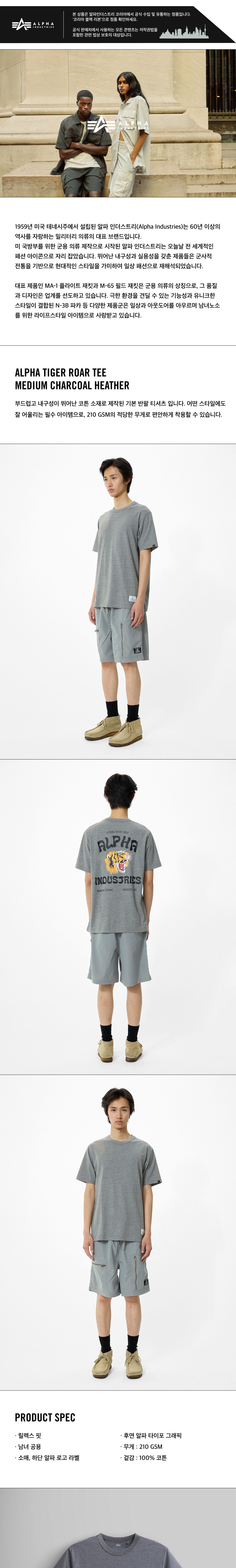알파 인더스트리 알파 타이거 로어 티셔츠 미디엄 차콜 헤더