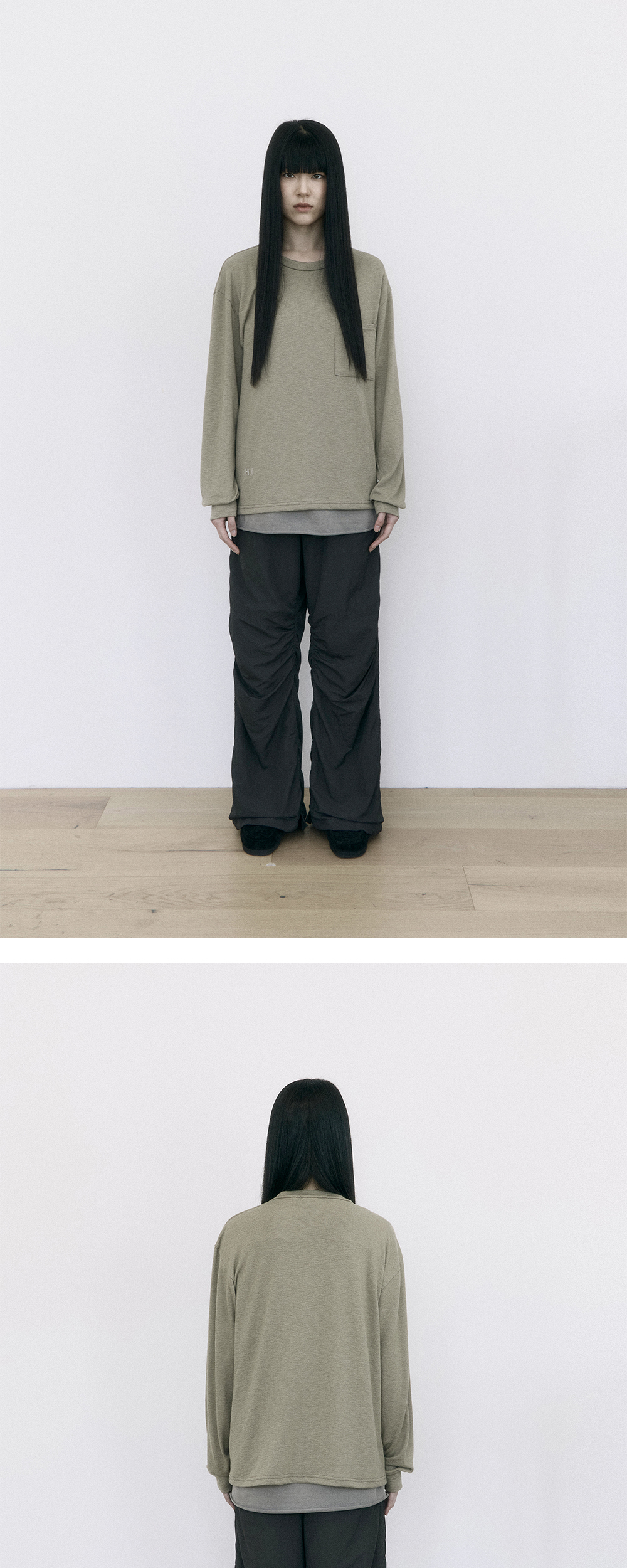 human pocket long sleeve - 슬러비한 텍스쳐의 포켓 롱슬리브 - 가먼트 워시 및 다잉 - 부드러운 촉감 - 드레이퍼리한 물성 - 단품 착용 기준, 휴먼 슬리브리스 및 이너티셔츠와의 매칭을 염두에 둔 패턴입니다.