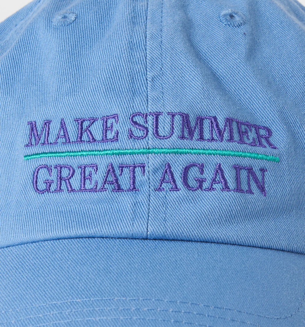 청량한 색감으로 포인트가 되어줄 에이오알의 메이크 썸머 그레이트 어게인 캡 스카이 블루입니다. - 전면 'Make Summer Great Again' 자수 - 후면 둘레 조절 스트랩 - 통기성과 착용감이 탁월한 면 100%으로 제작