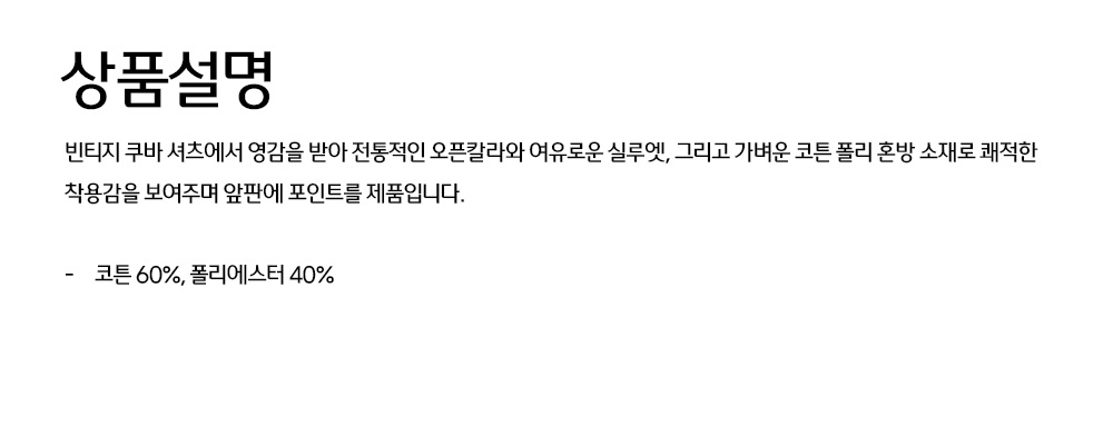 빈티지 쿠바 셔츠에서 영감을 받아 전통적인 오픈칼라와 여유로운 실루엣, 그리고 가벼운 코튼·폴리 혼방 소재로 쾌적한 착용감을 보여주며 앞판에 포인트 원단을 사용해 포인트를 준 제품입니다
