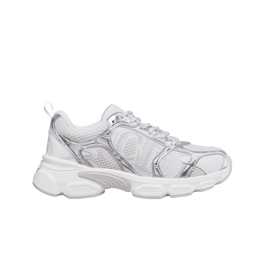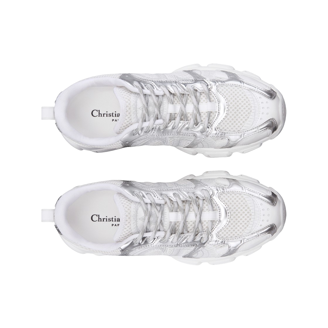 (W) Dior Chrono Sneakerss Mesh with Silver Tone and White Laminated Leather Effect Inserts White Silver