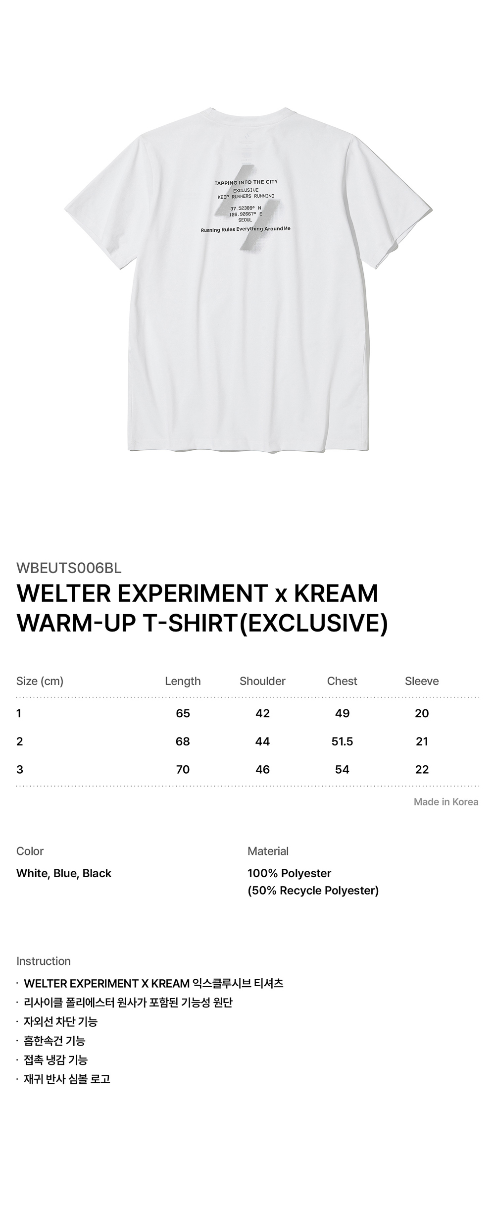 [ INSTRUCTION ] WELTER EXPERIMENT X KREAM 익스클루시브 티셔츠 리사이클 폴리에스터 원사가 포함된 기능성 원단 자외선 차단 기능 흡한속건 기능 접촉 냉감 기능 재귀 반사 심볼 로고 - 100% Polyester ( 50% Recycle Polyester )