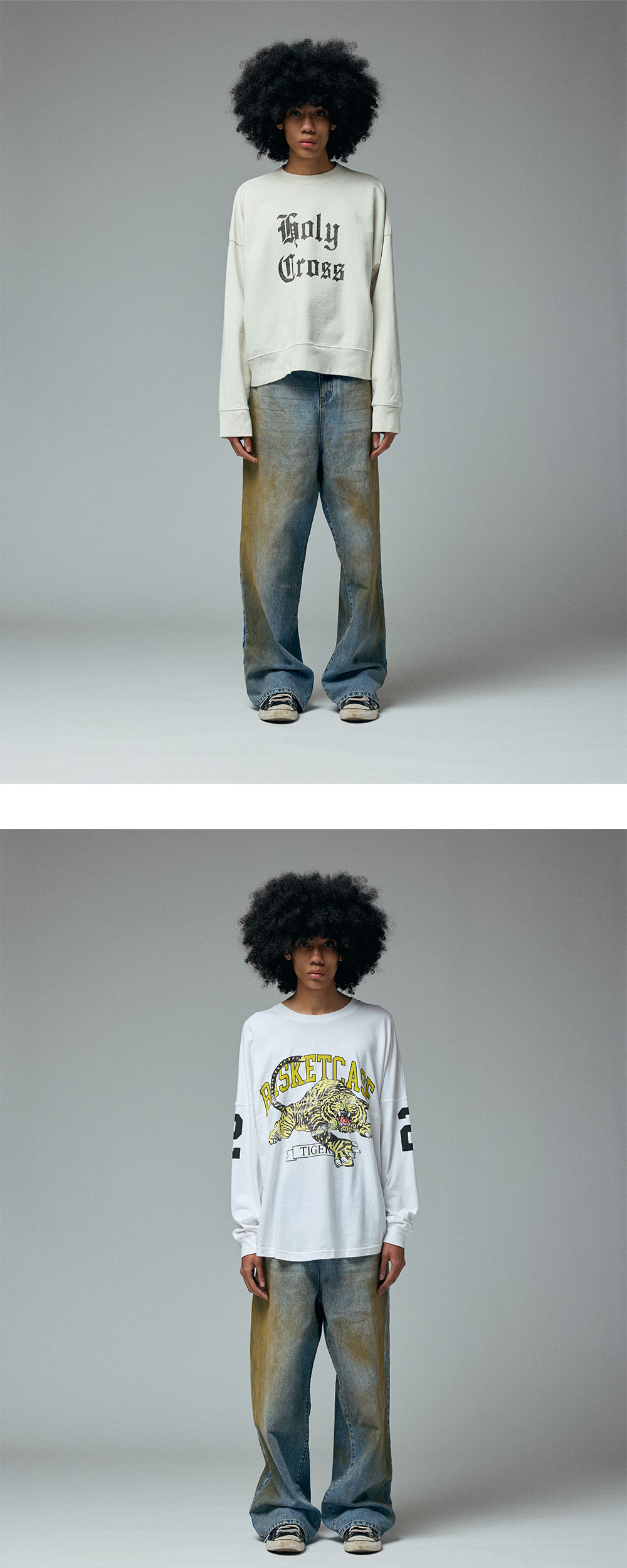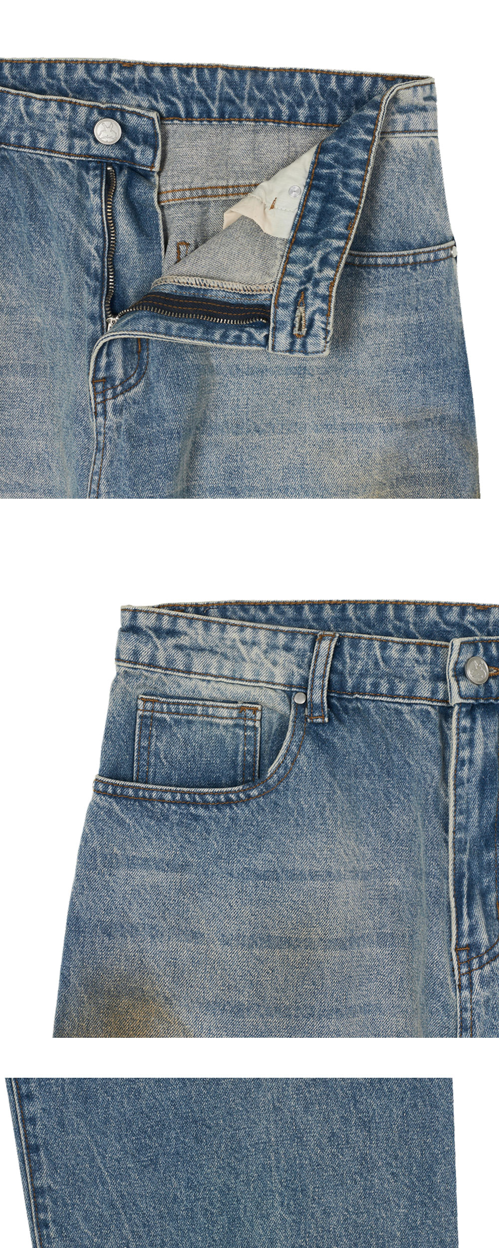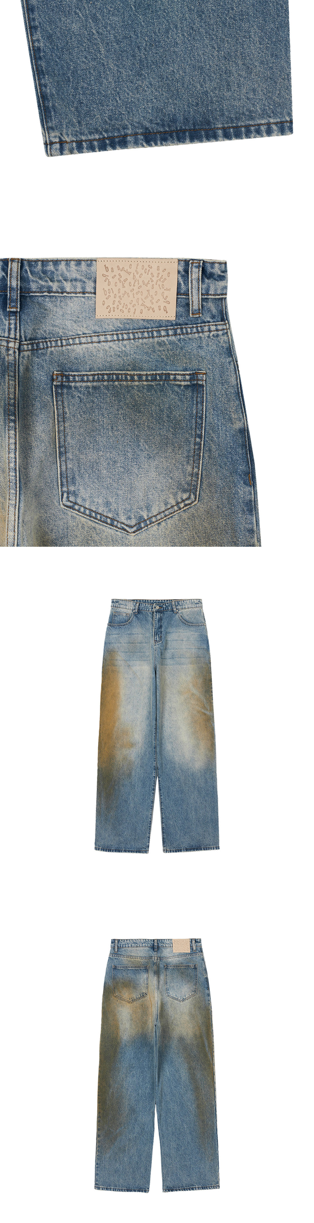 빈티지한 워싱이 돋보이는 바스켓케이스의 랙스 배기 데님 머드 워시 블루 더트입니다. - 오래 입은듯한 자연스러운 워싱 다지안 - 자연스럽게 흐르는 핏 - 허리 뒷면 패치 디테일