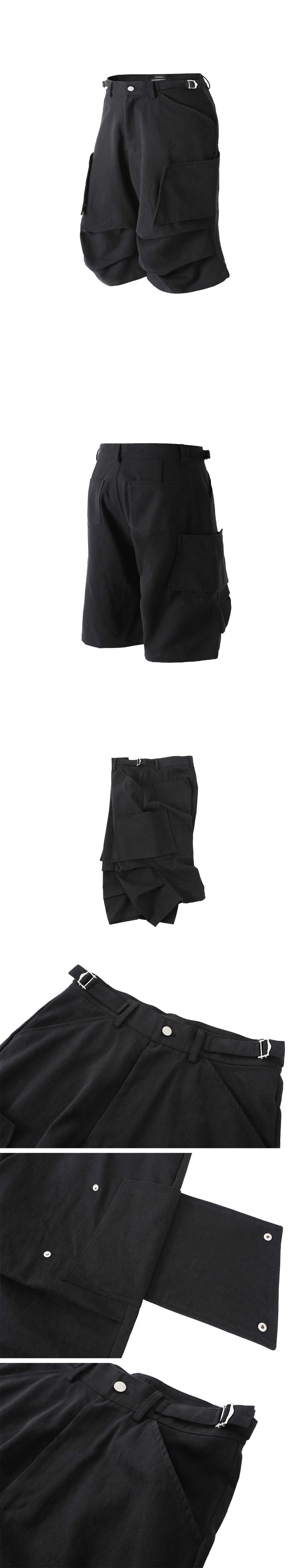Fabric : Cotton 100% - 버뮤다 핏 - 10's 고밀도 트윌 - 바이오 워싱 - 디자인 포켓 - 시그니처 켄톤 - 파라슈트 디테일 - 허리 사이즈 조절 비조 - 지퍼 및 스냅 YKK 社 제품 사용 • 제조국 : 대한민국 • 세탁 방법 : 찬물 세탁 권장, 건조기 사용 금지 Size Spec (CM) M : 허리 41, 허벅지 38, 밑위 38, 밑단 34, 엉덩이 60, 총장 70 L : 허리 44, 허벅지 40, 밑위 39, 밑단 35, 엉덩이 62, 총장 72