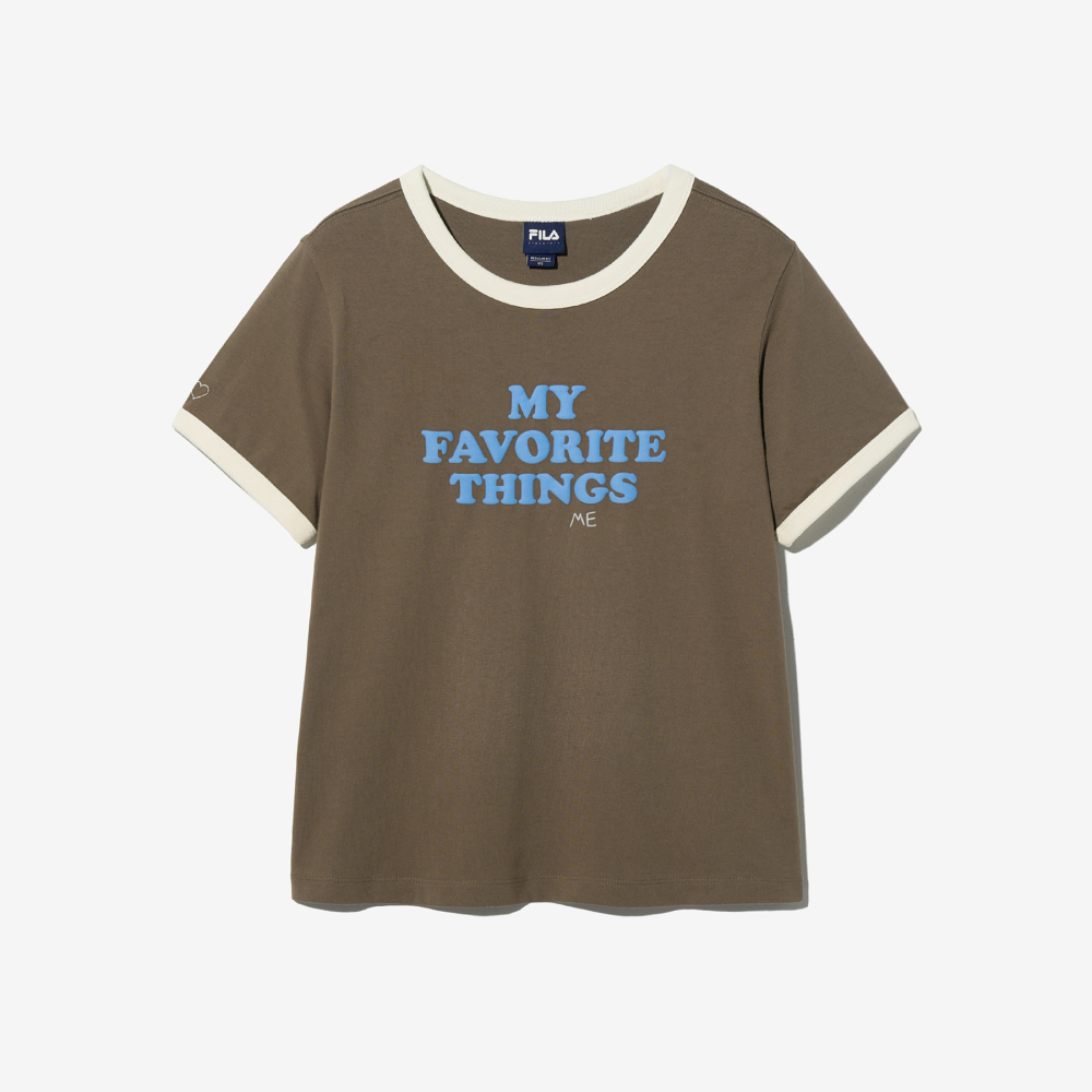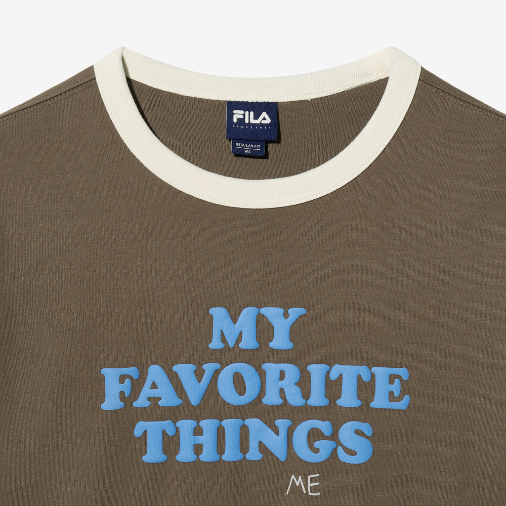 배색 포인트가 돋보이는 넥라인과 소매 디테일이 레트로한 감성을 강조해 줍니다. MY FAVORITE THINGS 레터링이 캐주얼하면서도 개성 있는 분위기를 연출합니다. 기본적인 실루엣에 감각적인 요소를 더한 아이템입니다.