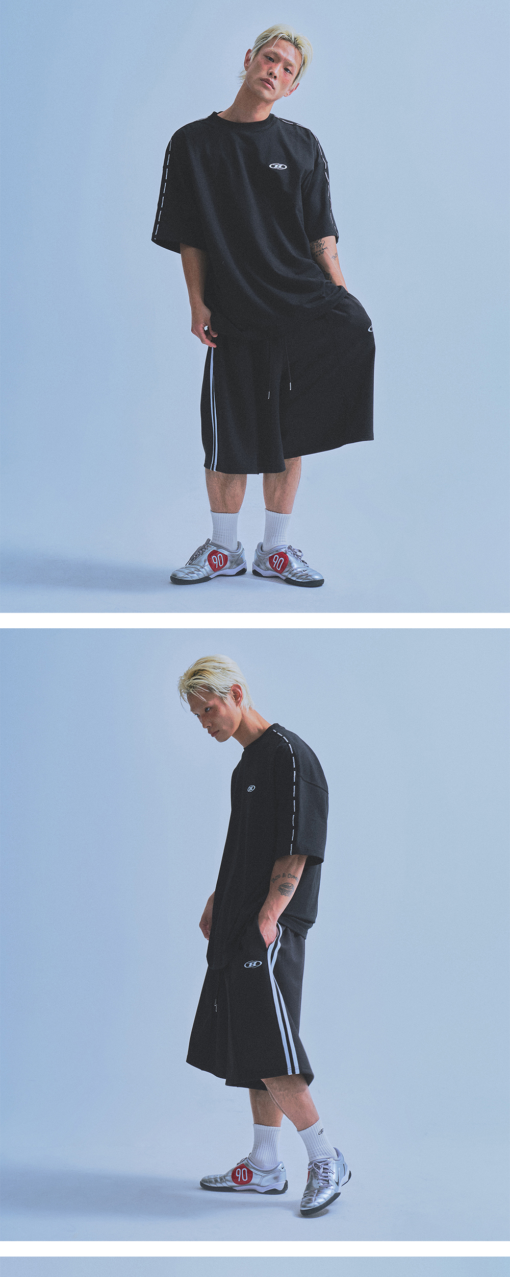 [DETAILS] * 심볼 B 트랙 라인 저지 버뮤다 팬츠 - 폴리스판 저지 - 핀턱 디테일 - 컬러 배색 트랙 라인 포인트 - B 자수 로고 포인트 - 버뮤다핏 Material : Polyester 91%, Polyurethane 6% Fitting : TJ 1 Size, 172cm, 74kg