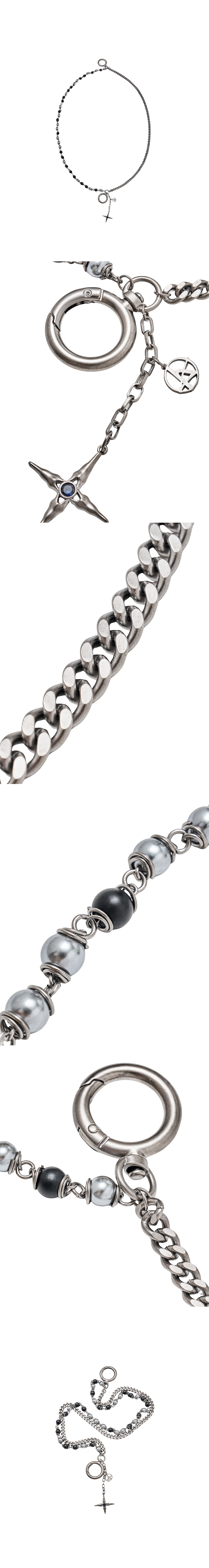 무광의 블랙 오닉스와 차콜 컬러의 메탈릭 진주로 이루어진 한 줄, 커브 체인이 구성된 또 한 줄이 함께 레이어드된 벨트 키체인입니다. 딥한 컬러톤의 조합이 시크하고 차분한 인상을 주며, 중앙에는 원석이 세팅된 십자가 형태의 메탈 참이 포인트로 들어가 있습니다. 벨트고리나 가방 스트랩 등에 걸어 다양하게 활용할 수 있습니다. *천연 원석 특성상 개체 차이가 있을 수 있는 점 참고 부탁드립니다.* *수작업으로 철사를 연결시키는 과정에서 미세한 기스가 있을 수 있습니다.* - DETAIL - 커브 체인과 원석 체인의 투-웨이 레이어 구성 십자가 형태의 메탈 참 디테일