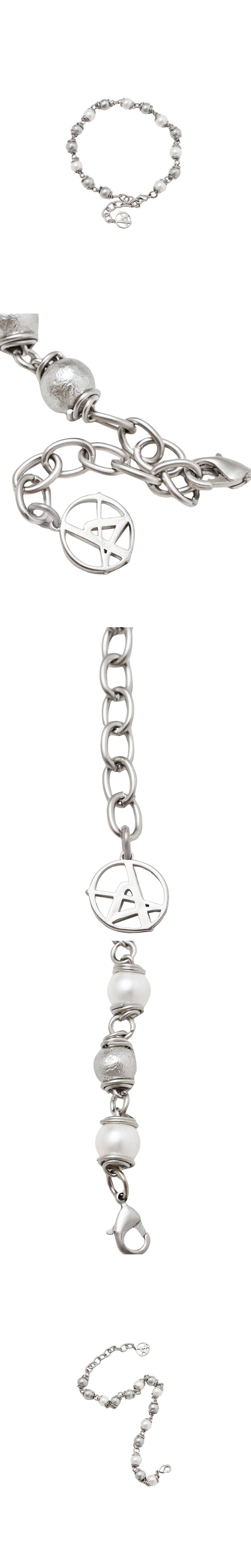 메탈릭 진주와 화이트 진주가 섞여 고급스러운 컬러와 텍스처의 조화를 이루는 브레이슬릿입니다. 두 가지 진주의 믹스가 시각적인 깊이감을 더하며, 단독으로 착용해도, 레이어링을 통해 더욱 돋보일 수 있는 아이템입니다. *천연 원석 특성상 개체 차이가 있을 수 있는 점 참고 부탁드립니다.* *수작업으로 철사를 연결시키는 과정에서 미세한 기스가 있을 수 있습니다.* - DEATIL - 로고 메탈 참