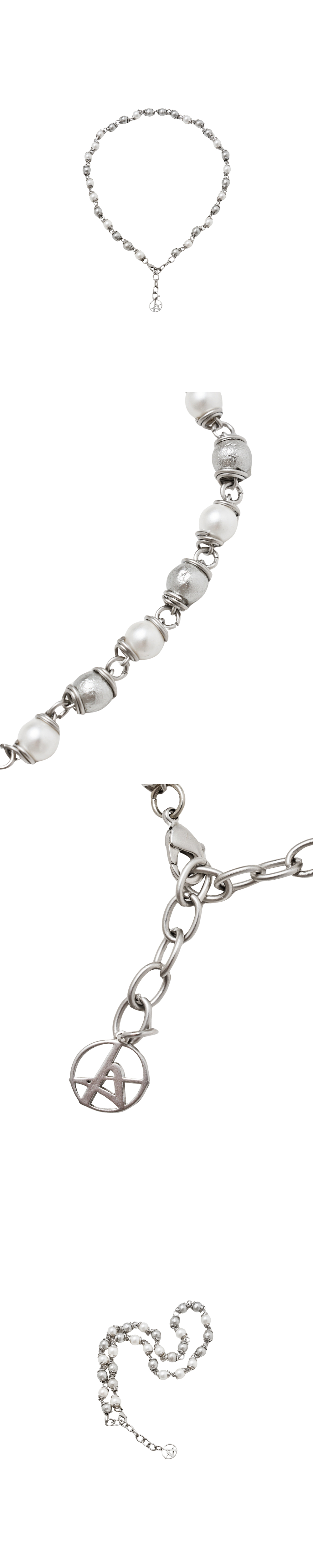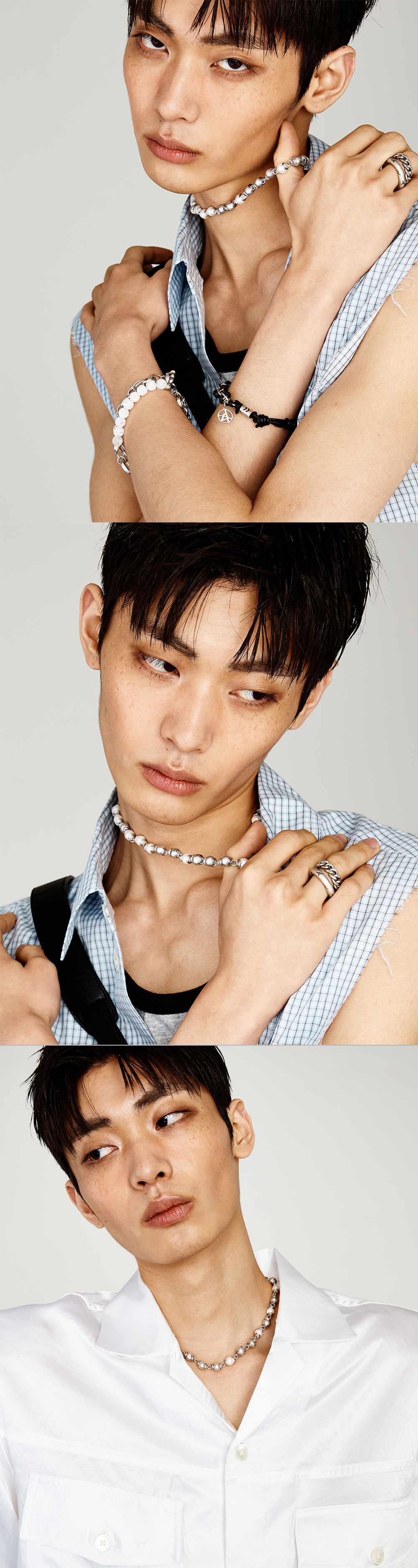 메탈릭 진주와 화이트 진주가 섞여 고급스러운 컬러와 텍스처의 조화를 이루는 네크리스입니다. 두 가지 진주의 믹스가 시각적인 깊이감을 더하며, 단독으로 착용해도, 레이어링을 통해 더욱 돋보일 수 있는 아이템입니다. *천연 원석 특성상 개체 차이가 있을 수 있는 점 참고 부탁드립니다.* *수작업으로 철사를 연결시키는 과정에서 미세한 기스가 있을 수 있습니다.* - DEATIL - 로고 메탈 참