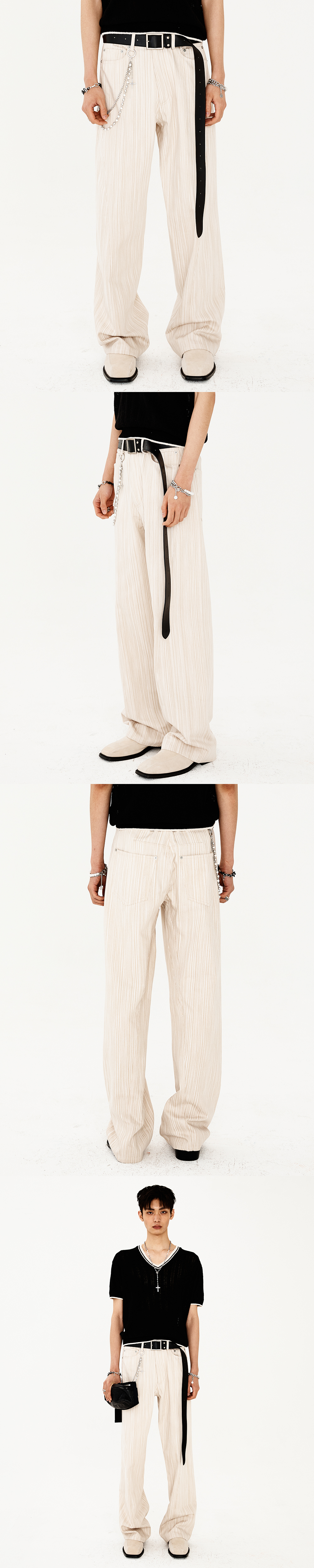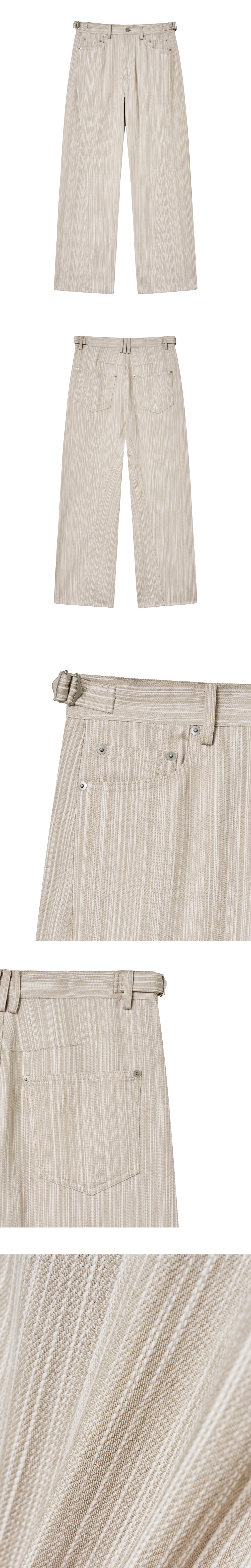입체적인 트위스트 형태의 심라인으로 제작된 스트레이트 팬츠입니다. 슬럽 텍스처의 배색으로 은은한 스트라이프 패턴이 자연스러운 입체감을 더하며, 베이직한 듯 감각적인 스타일을 완성합니다. -DETAIL- 레귤러 핏 입체적인 트위스트 심라인 허리 양 사이드 조절이 가능한 벨티드 디테일 리벳 디테일 -model- 186cm / 가슴둘레 91cm / 허리둘레 69cm / 엉덩이둘레 87cm - 2사이즈 착용 * 모델의 경우 총장이 5cm 더 길게 제작된 제품을 착용 *