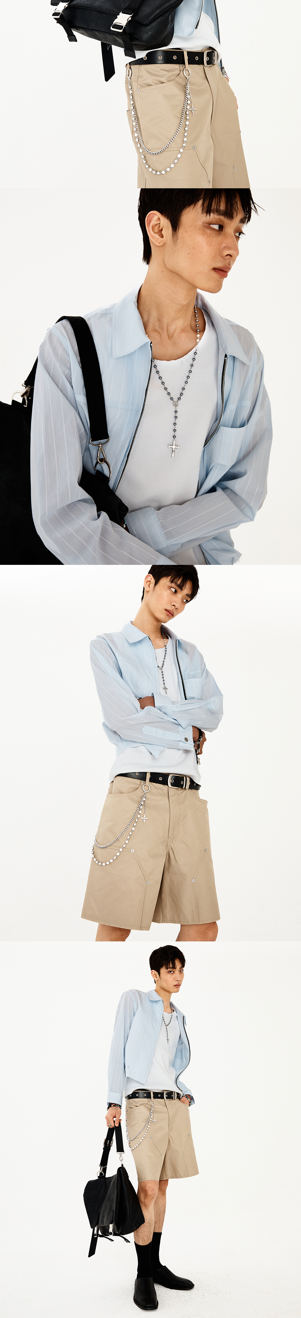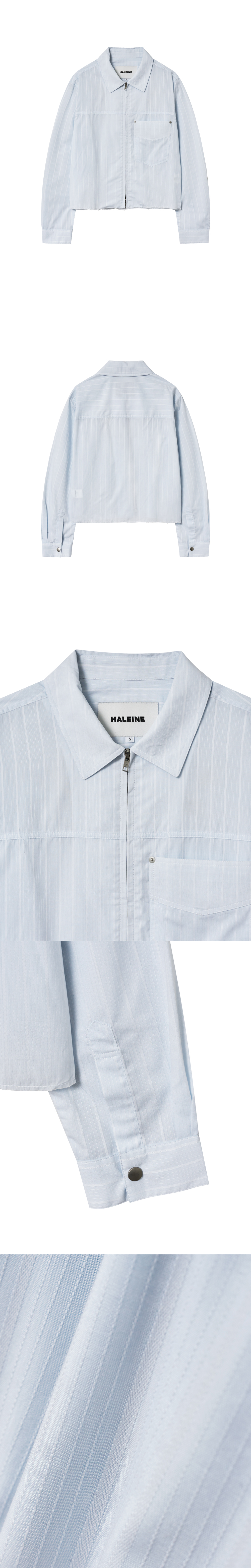 시스루한 텍스처의 스트라이프 원단으로 제작한 집업 셔츠입니다. 얇고 가벼운 소재로 한여름에도 착용 가능하며, 전면 지퍼 여밈과 크롭한 기장으로 구조적인 실루엣을 완성합니다. 밑단은 컷오프 디테일로 마감되어 자연스럽고 날렵한 인상을 줍니다. -DETAIL- 크롭 핏 전면 지퍼 여밈 플랩포켓 형태를 가진 패치포켓 컷-오프 처리된 밑단 *밑단의 경우 자연스럽게 올이 풀리며 하단의 봉제선 이상은 풀리지 않습니다* -model- 186cm / 가슴둘레 83cm / 허리둘레 70cm / 엉덩이둘레 90cm - 2사이즈 착용