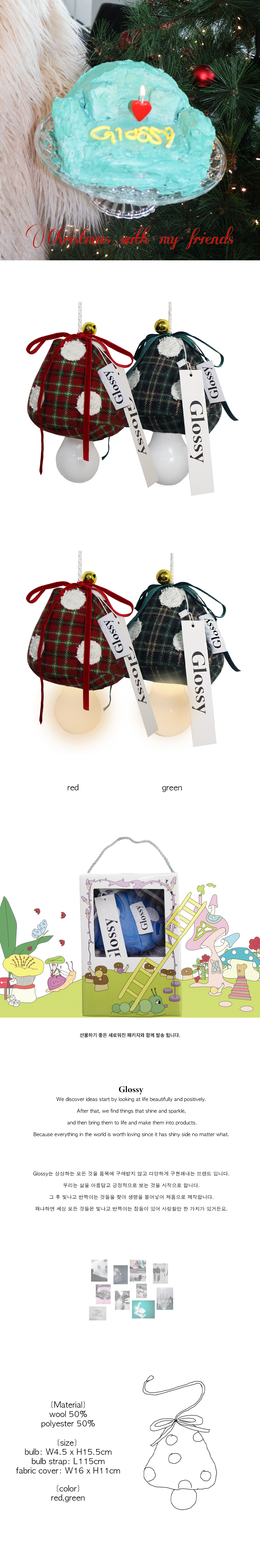 Christmas with my friends♥️ 크리마스 기념 출시된 타탄체크 머쉬룸 램프 입니다. 크리스마스 분위기를 한층 올려줄 수 있는 로맨틱한 아이템 입니다. 잘 자란 크리스마스 버섯 수확해 가세요!🍄 램프 크기: 4.5cm*15.5cm, 끈 길이: 115cm 버섯 크기: 16*11cm 전구: pp, abs(건전지 미포함) 원단: 울 50% 폴리에스테르 50% 충전재: 폴리 100% * 제품과 함께 동봉되는 사용법 카드를 꼭 참조해 사용해주시고, 세탁 해주세요.