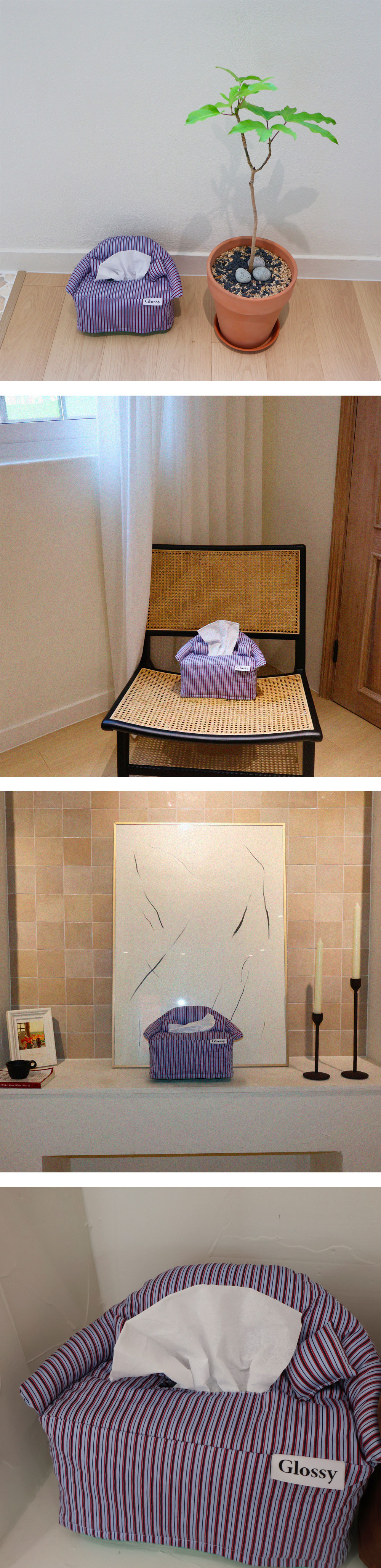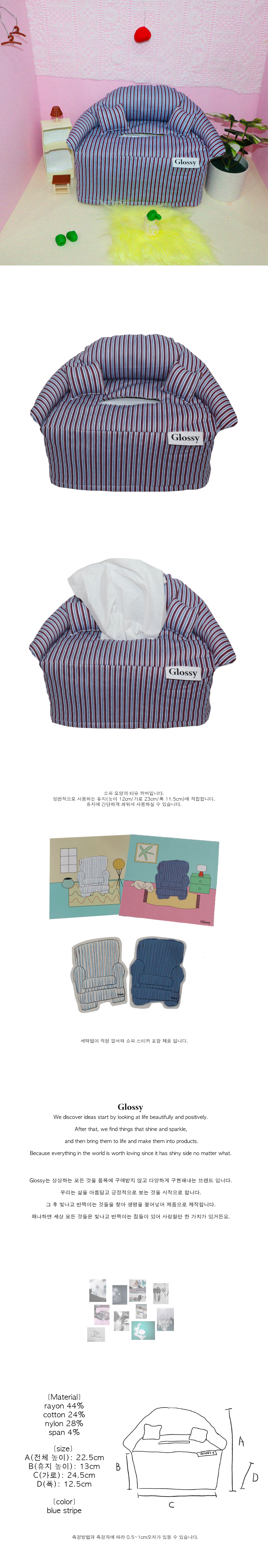 소파 모양의 티슈 커버입니다. 일반적으로 사용하는 휴지(높이 12cm/가로 23cm/폭 11.5cm)에 적합합니다. 휴지에 간단하게 씌워서 사용하실 수 있습니다. 정확한 사이즈는 상세페이지 참조 부탁드립니다. 원단: 면 24% 레이온 44% 나일론 28% 스판 4% * 제품과 함께 동봉되는 세탁법 카드를 꼭 참조하여 세탁해주세요.