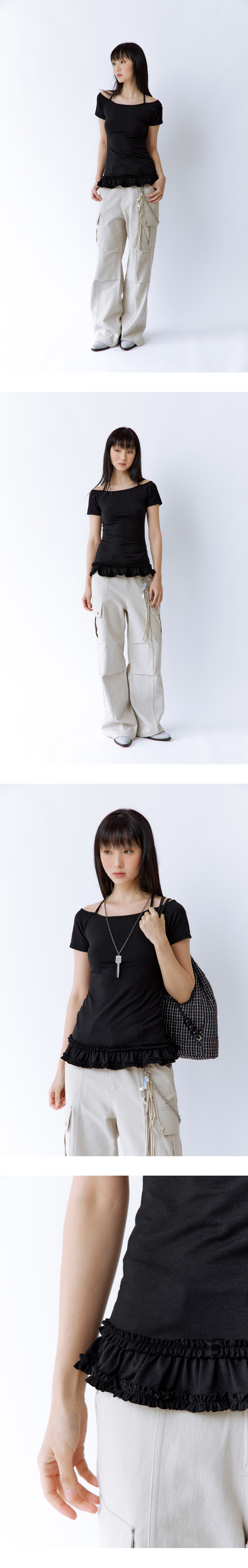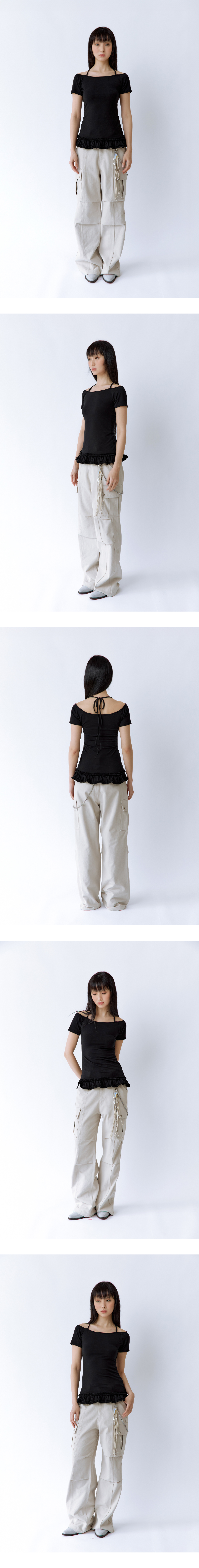 목에 끈을 묶어 착용하는 스타일의 티셔츠로, 어깨와 목선을 예쁘게 잡아주는 오프숄더 디자인입니다. 밑단에는 이중 러플 디테일이 더해져 베이직한 실루엣에 포인트를 줍니다. Model size : SUJI 170cm 50kg / SUMMER 167cm 49kg Fitting size : S Material : Polyester 61% Cotton 33% Span 6%