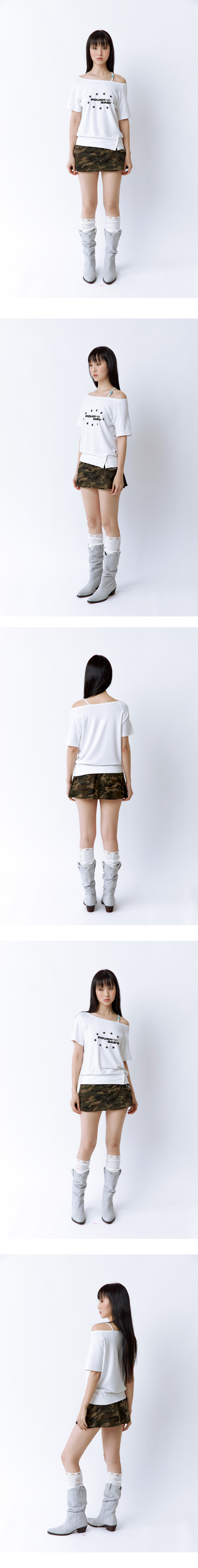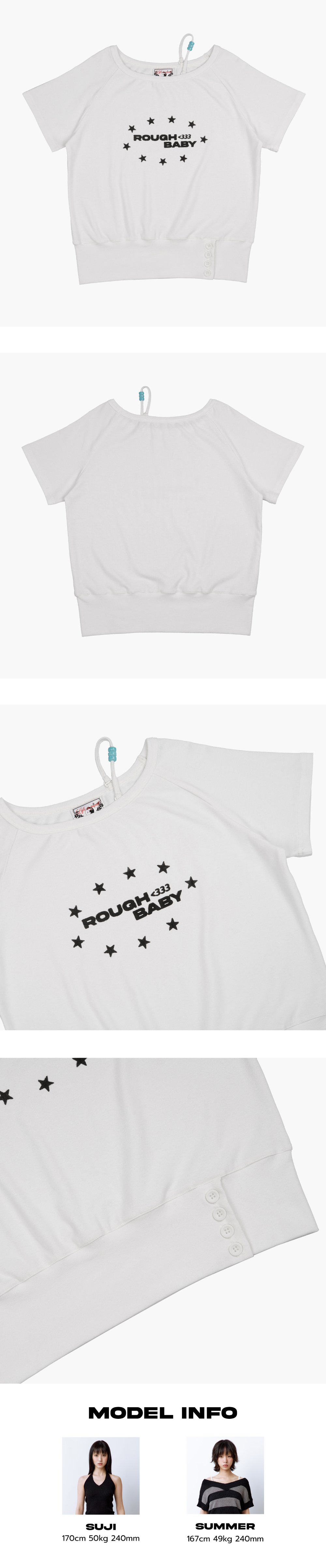 한쪽 어깨 끈에 더해진 컬러 비즈 디테일이 포인트가 되어주며, 끈은 탈부착이 가능해 스타일에 따라 오프숄더 또는 일반 티셔츠처럼 자유롭게 연출할 수 있습니다. 신축성 좋은 원단을 사용해 편안한 착용감을 제공하며, 원하는 만큼 어깨를 내려 실루엣을 연출할 수 있습니다. 밑단에는 단추 디테일이 있어 착용하는 하의에 따라 핏을 조절할 수 있습니다. Model size : SUJI 170cm 50kg / SUMMER 167cm 49kg Fitting size : S Material : Cotton 55% Rayon 37% Span 8%