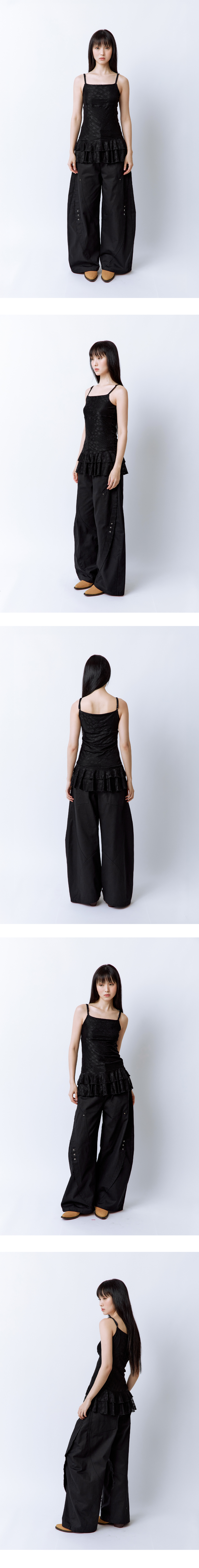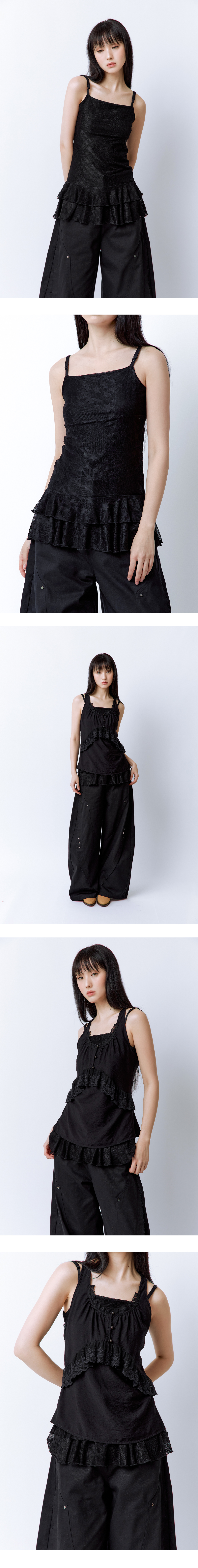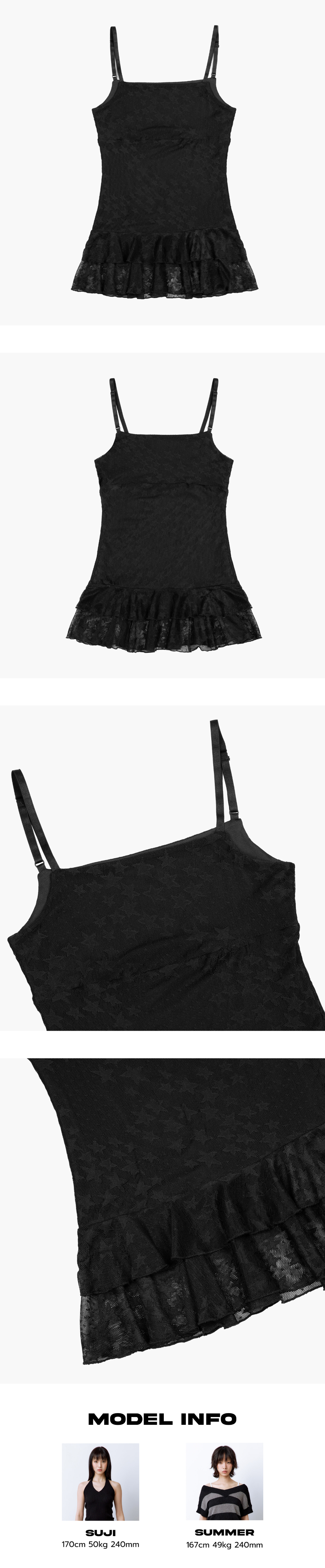 은은한 별 패턴의 매쉬 원단과 밑단의 이중 러플 디테일이 사랑스러운 포인트가 되어주는 레이어드 탑입니다. 가볍고 시원한 착용감으로 끈은 길이 조절이 가능해 체형에 맞게 착용할 수 있으며, 단독은 물론 다양한 상의에 레이어드해 귀엽게 연출할 수 있습니다. 안감이 더해져 비침 걱정 없이 착용 가능합니다. Model size : SUJI 170cm 50kg / SUMMER 167cm 49kg Fitting size : S Material : Cotton 90% Span 10%
