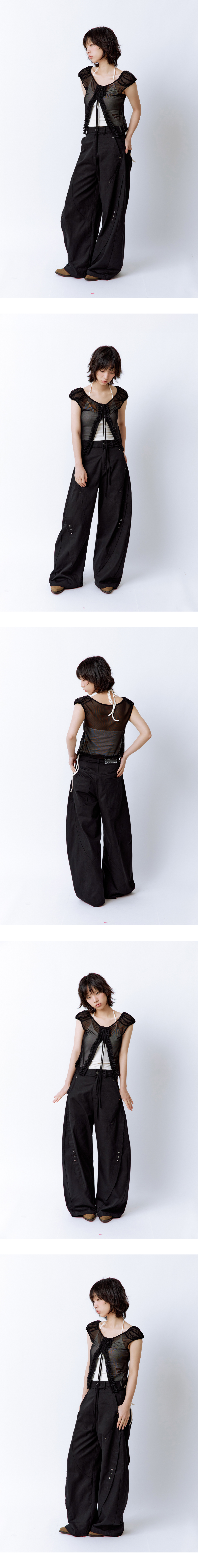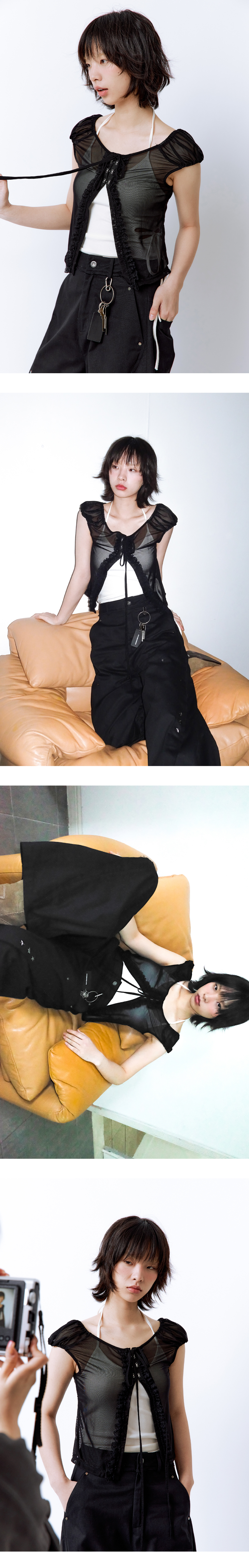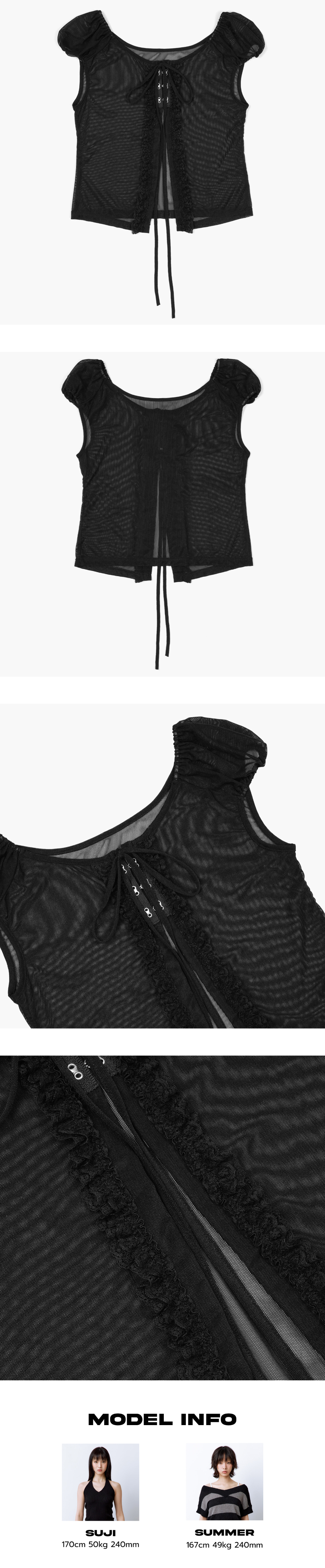 신축성이 뛰어난 매쉬 원단으로 제작되어 가볍고 편안한 착용감의 레이어드 탑입니다. 귀여운 퍼프 소매와 가슴 부분의 볼드한 후크 디테일이 시선을 끌며, 리본과 2단 레이스 디테일이 포인트를 더합니다. 가볍고 얇은 소재로 여름철 다양한 스타일에 매치할 수 있습니다. Model size : SUJI 170cm 50kg / SUMMER 167cm 49kg Fitting size : S Material : Nylon 93% Polyurethane 7%