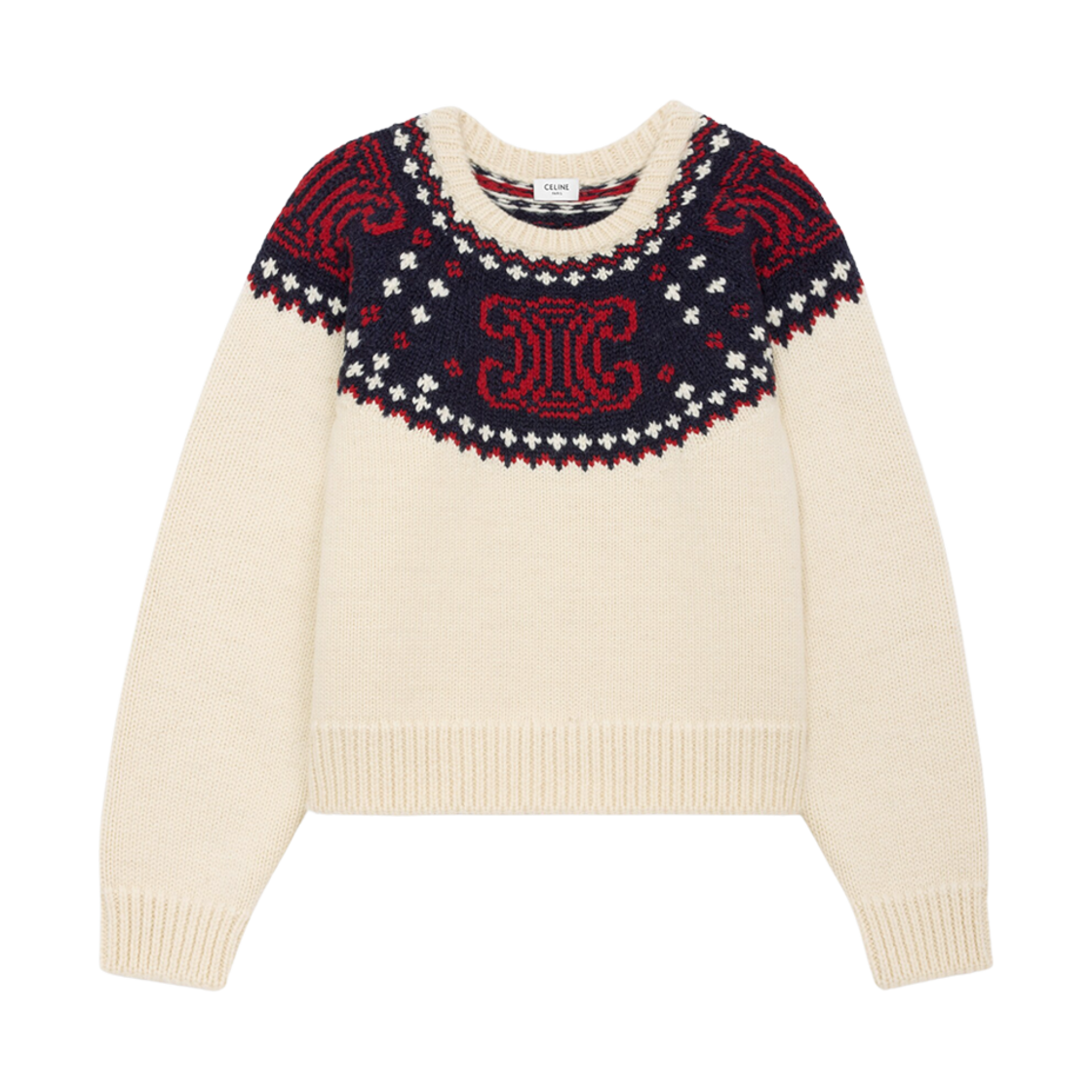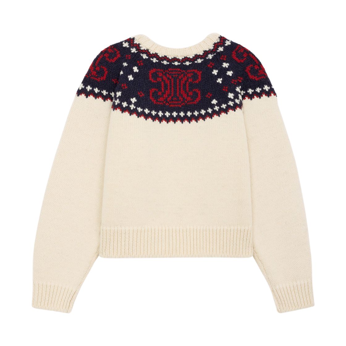 (W) Celine Triomphe Crew Neck Sweater in Fair Isle Wool Off White Navy