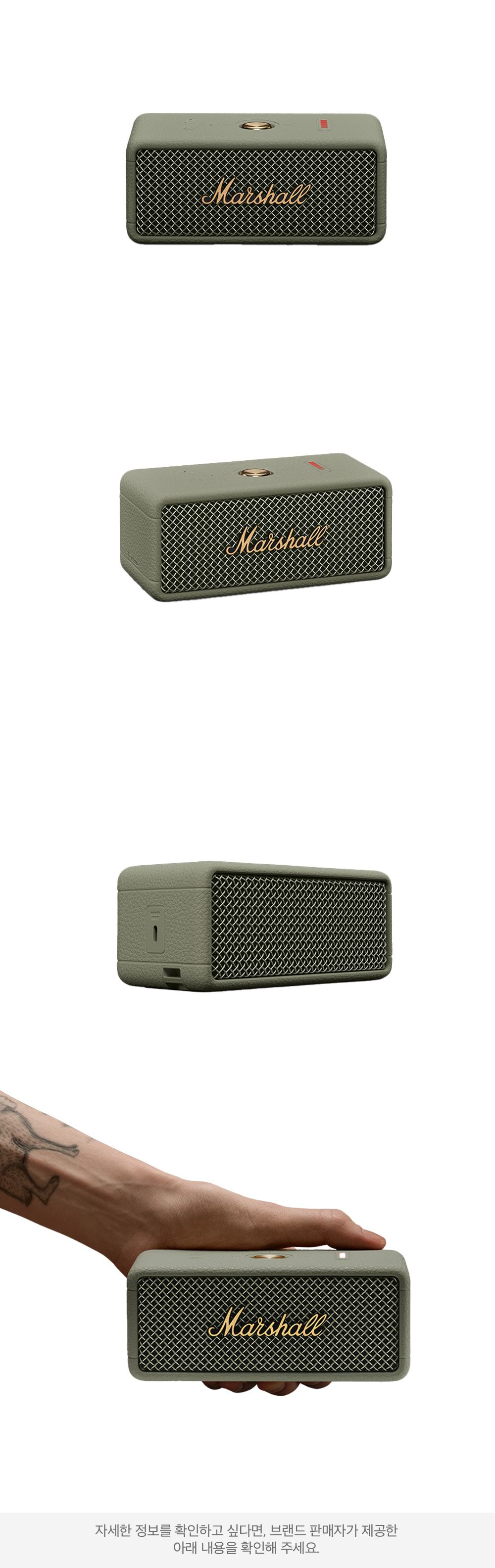 Emberton III는 Marshall의 생생한 프리미엄 사운드를 제공하는 휴대용 스피커이며 모든 지점이 스위트 스팟인 독특한 다방향 입체 사운드로 수준 높은 360° 사운드를 경험 할 수 있고 견고한 내구성과 최고 수준의 방진 및 방수 등급(IP67)로 캠핑, 여행, 운동 등의 야외 활동 시 활용도가 높습니다.