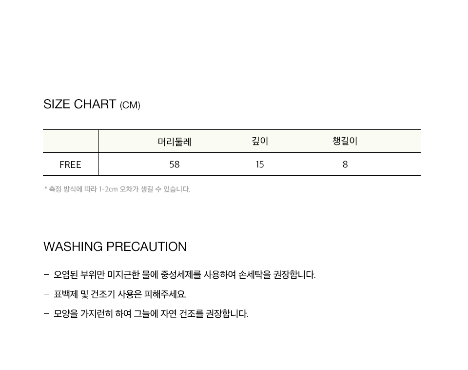 | 머리둘레 | 깊이 | 챙길이 |
