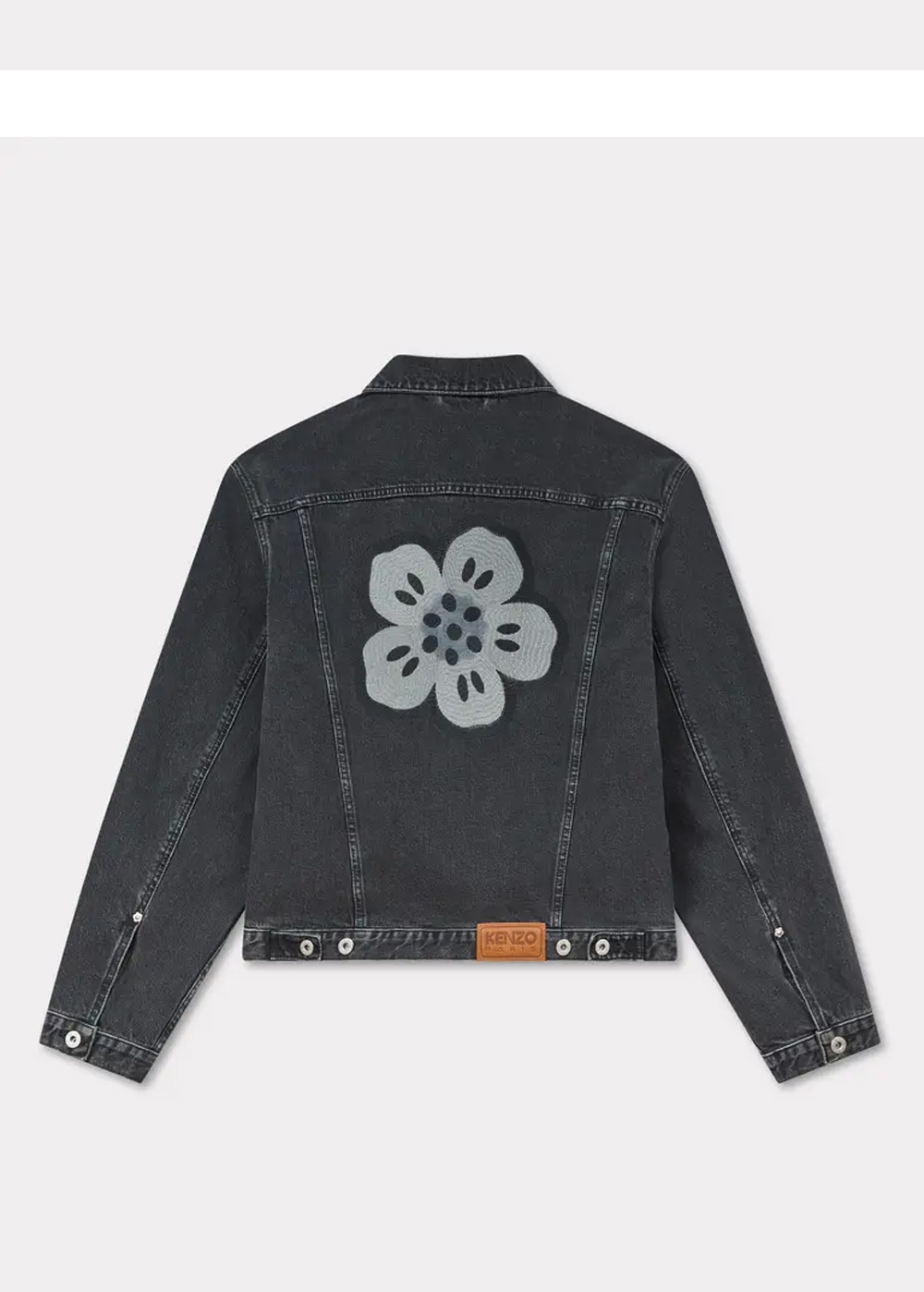 자수가 매력적인 겐조 보크 플라워 자수 트러커 자켓 인 재패니즈 데님 스톤 블리치드 블랙 데님입니다. - 박스형 크롭핏 - '보케 플라워' 자수 - 스톤 블리치 데님 - 사이드 포켓 2개, 가슴 포켓 2개